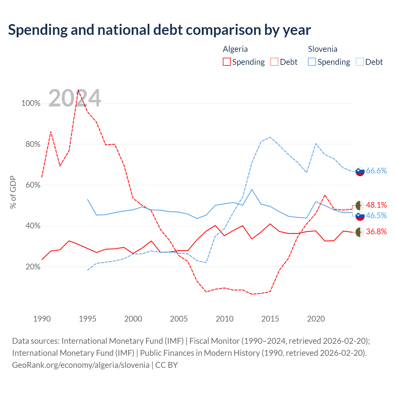 Algeria has $129B in government debt (48.1% of GDP), compared to $48.6B (66.6% of GDP) in Slovenia.