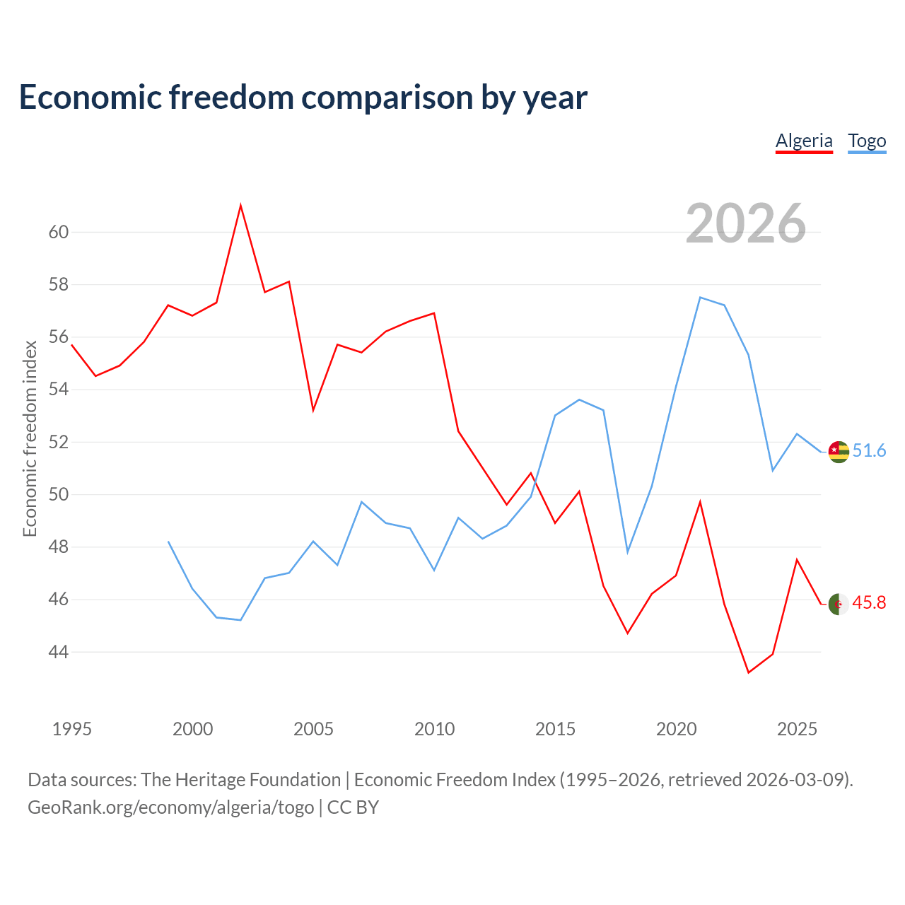 The Economic Freedom Index for Algeria is 45.8, ranking 179/197, compared to 51.6 for Togo, ranking 153/197. The chart above displays a comparison of annual changes in economic freedom indexes.
