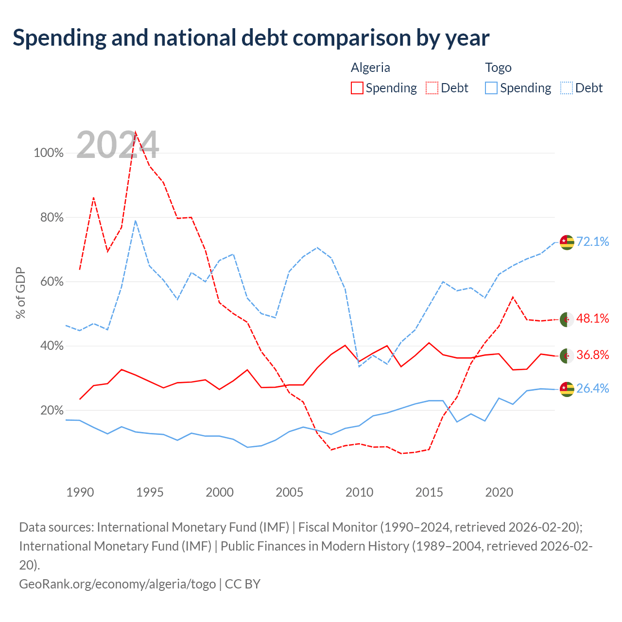 Algeria has $129B in government debt (48.1% of GDP), compared to $7.68B (72.1% of GDP) in Togo.