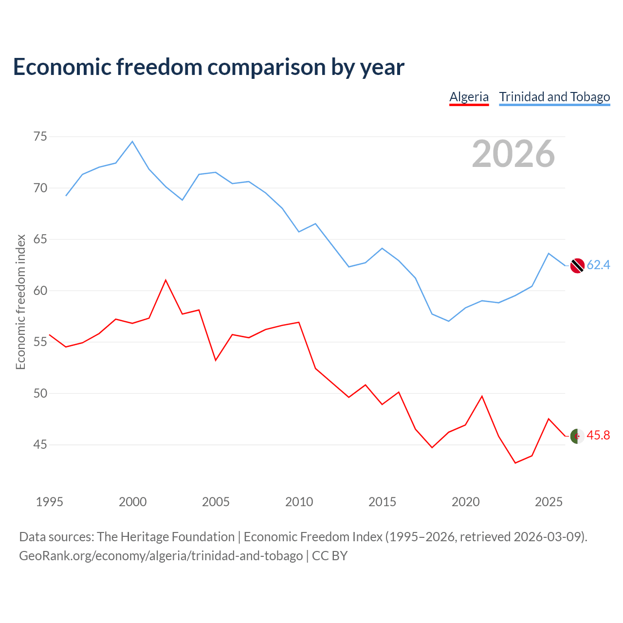 The Economic Freedom Index for Algeria is 45.8, ranking 179/197, compared to 62.4 for Trinidad and Tobago, ranking 87/197. The chart above displays a comparison of annual changes in economic freedom indexes.