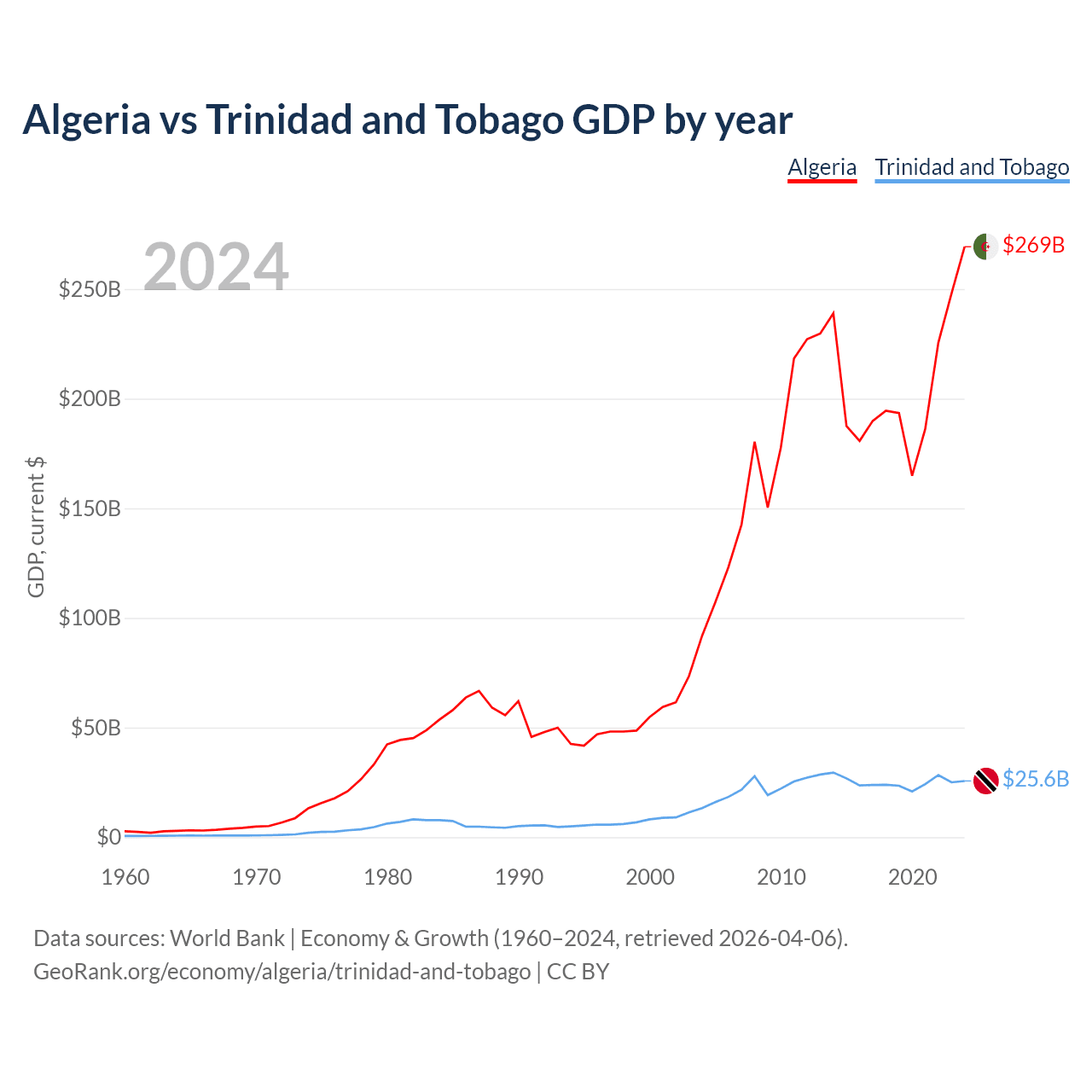 Algeria has a GDP of $269B compared to $25.6B for Trinidad and Tobago, ranking 51/197 and 115/197 by economy size, respectively.