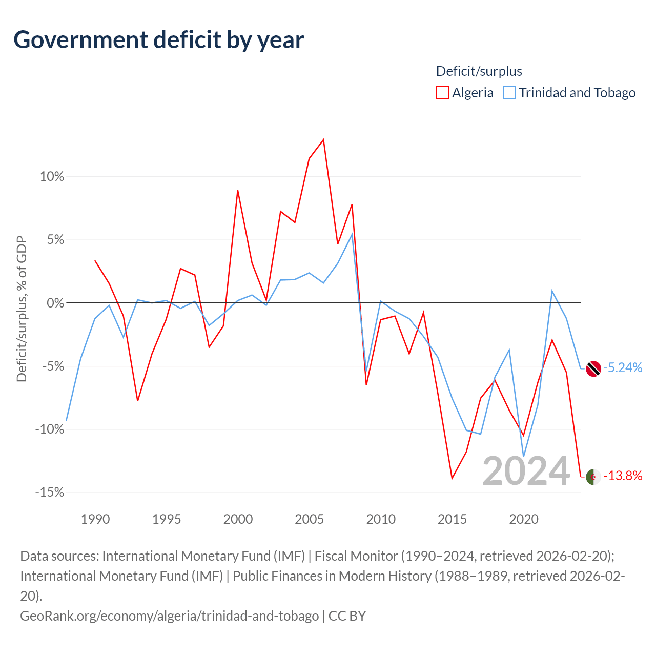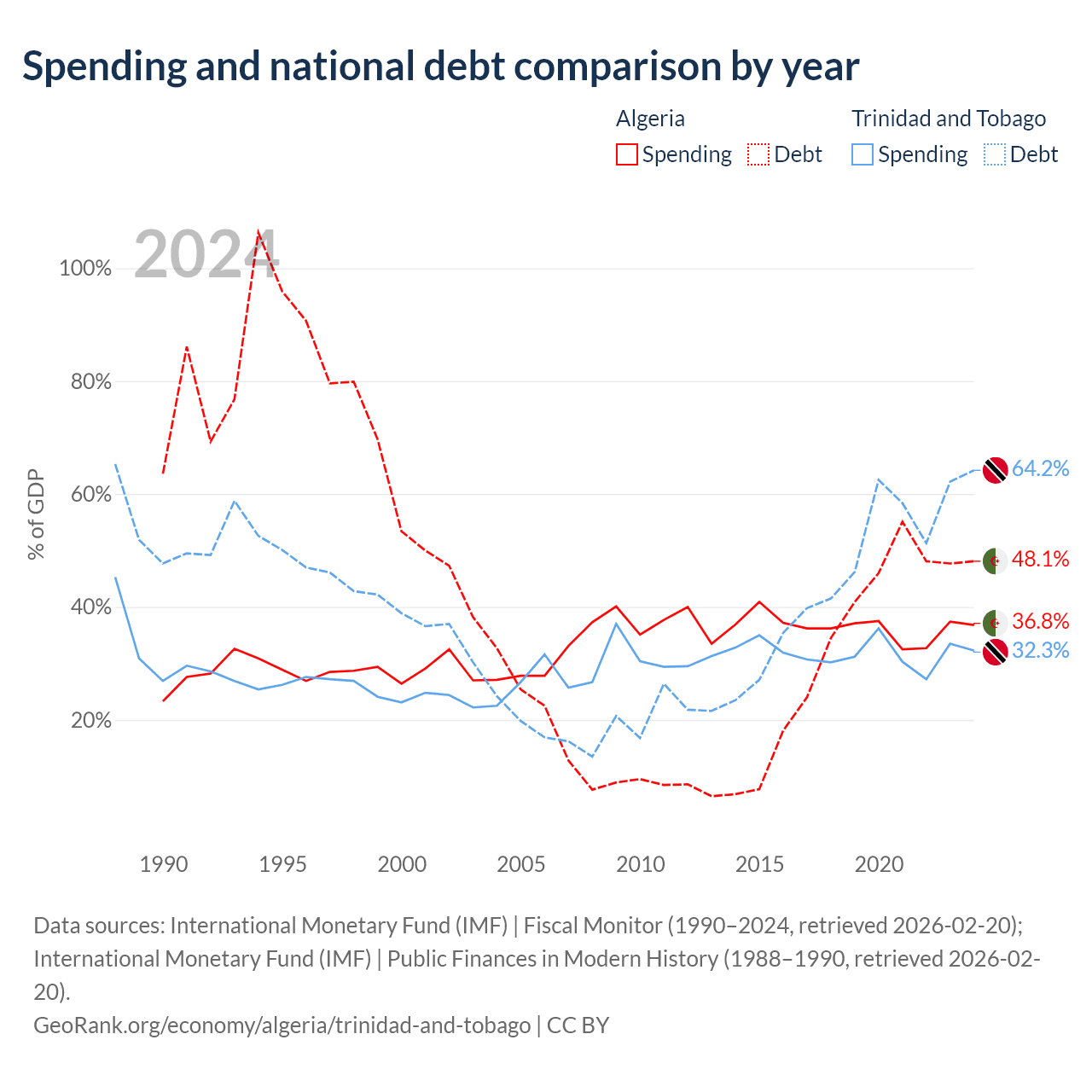 Algeria has $129B in government debt (48.1% of GDP), compared to $16.5B (64.2% of GDP) in Trinidad and Tobago.