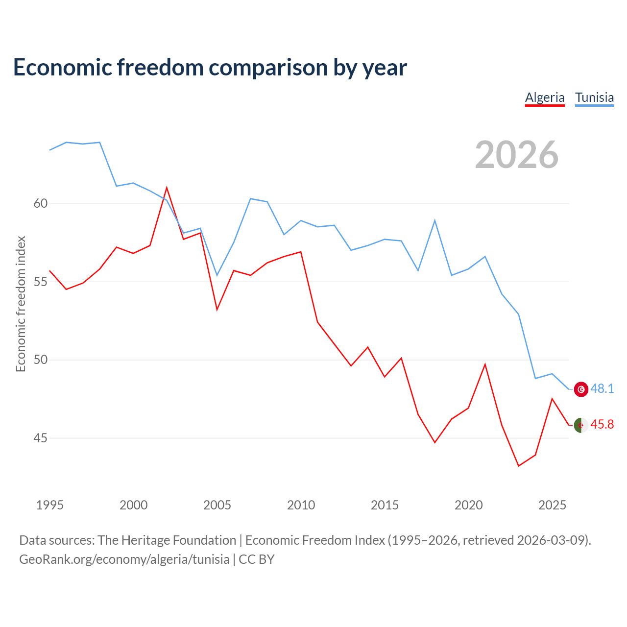 The Economic Freedom Index for Algeria is 45.8, ranking 179/197, compared to 48.1 for Tunisia, ranking 172/197. The chart above displays a comparison of annual changes in economic freedom indexes.