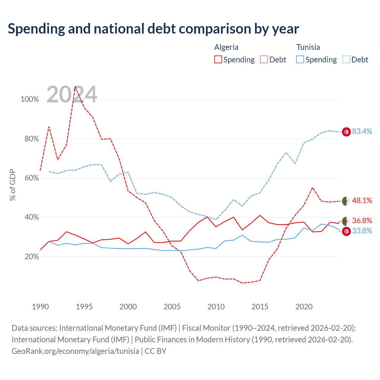 Algeria has $129B in government debt (48.1% of GDP), compared to $42.8B (83.4% of GDP) in Tunisia.