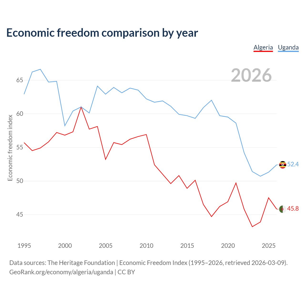 The Economic Freedom Index for Algeria is 45.8, ranking 179/197, compared to 52.4 for Uganda, ranking 149/197. The chart above displays a comparison of annual changes in economic freedom indexes.