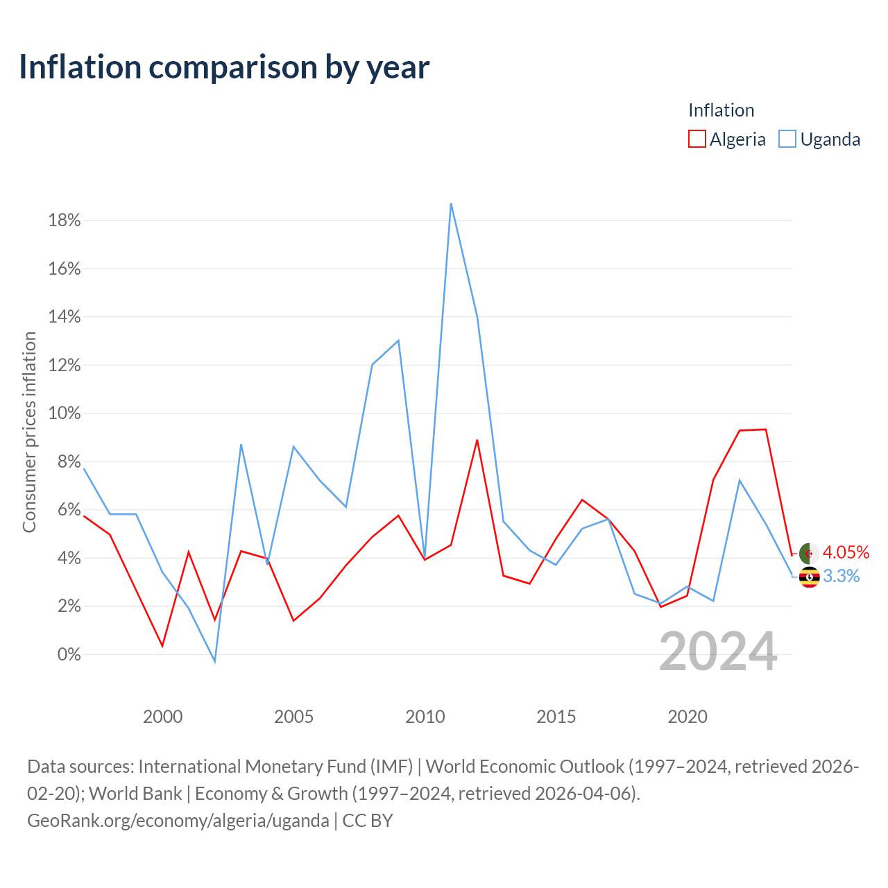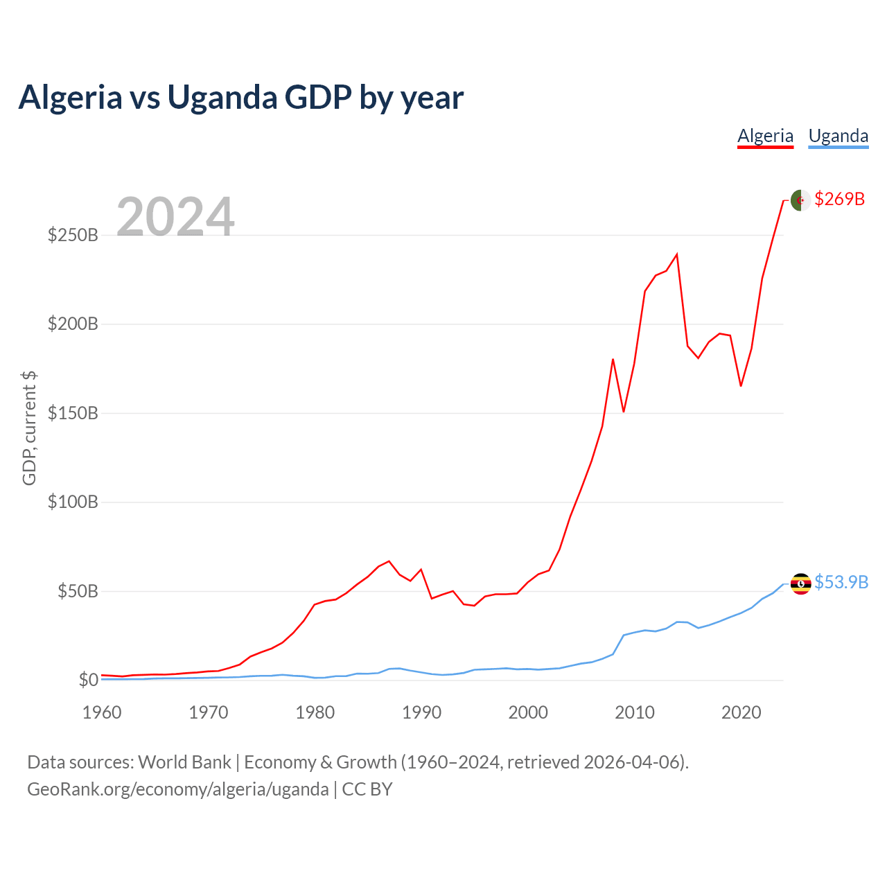 Algeria has a GDP of $269B compared to $53.9B for Uganda, ranking 51/197 and 89/197 by economy size, respectively.