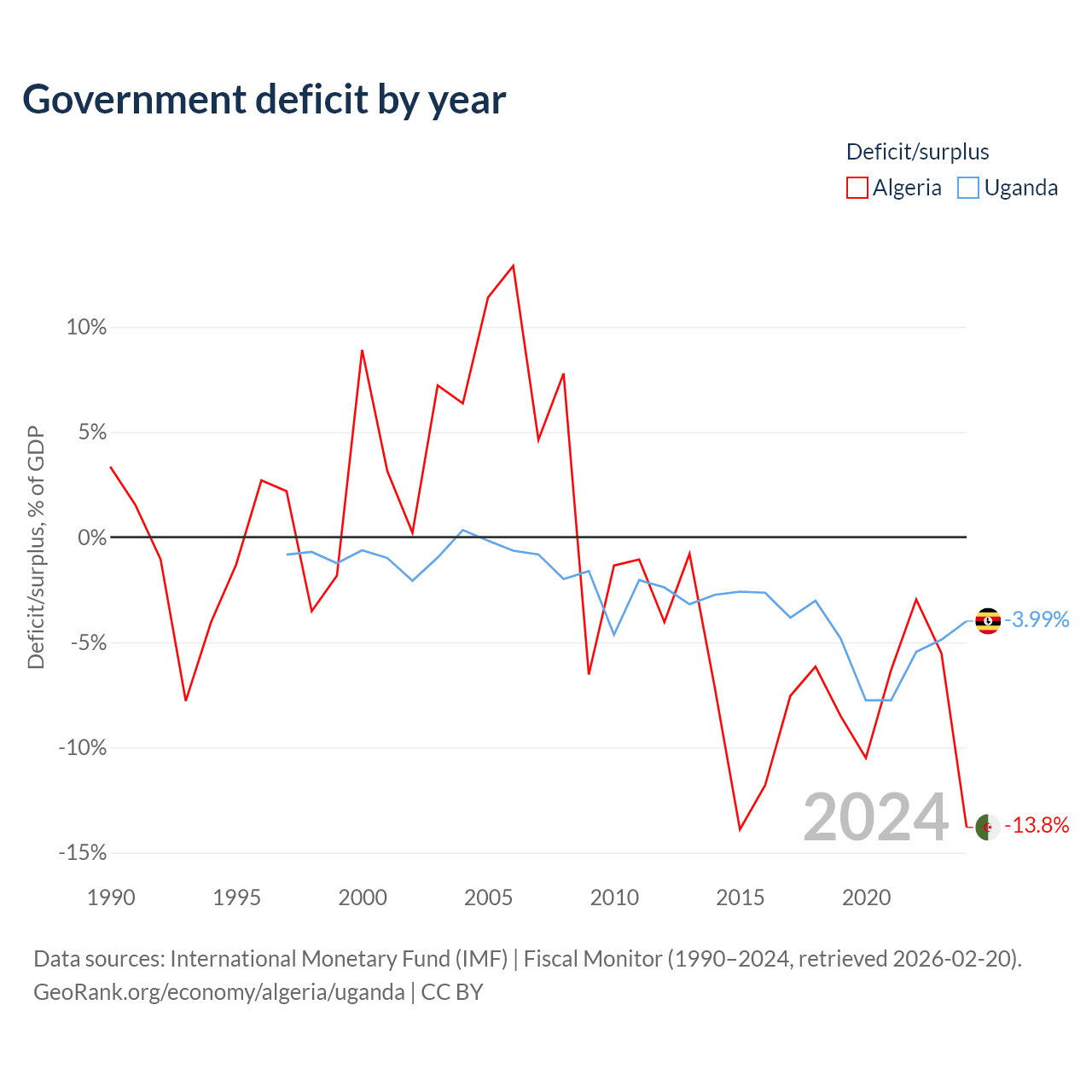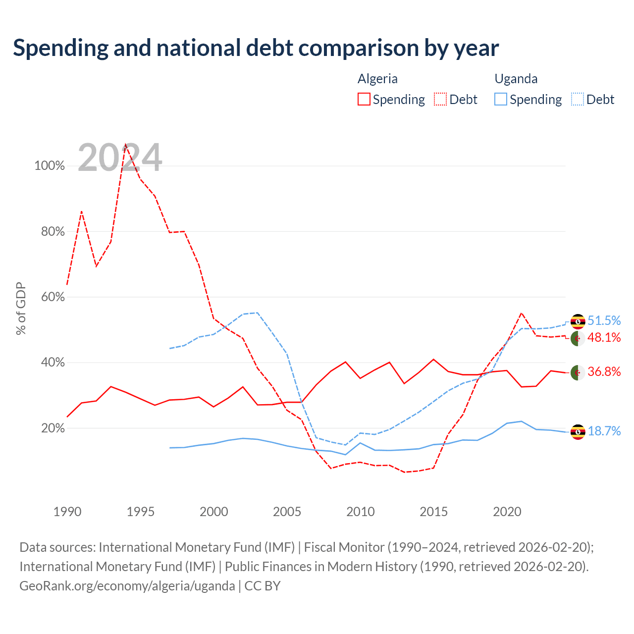 Algeria has $129B in government debt (48.1% of GDP), compared to $27.8B (51.5% of GDP) in Uganda.