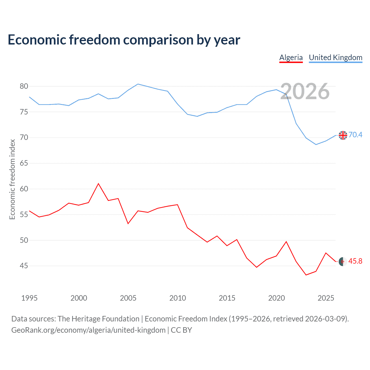 The Economic Freedom Index for Algeria is 45.8, ranking 179/197, compared to 70.4 for the United Kingdom, ranking 35/197. The chart above displays a comparison of annual changes in economic freedom indexes.