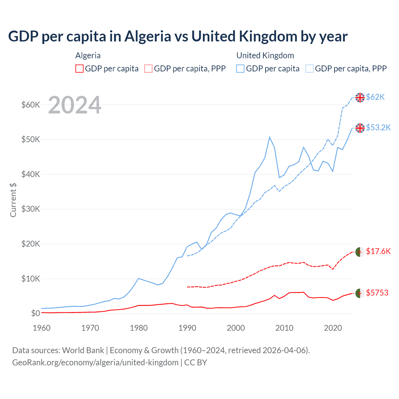 GDP per capita in Algeria vs United Kingdom by year