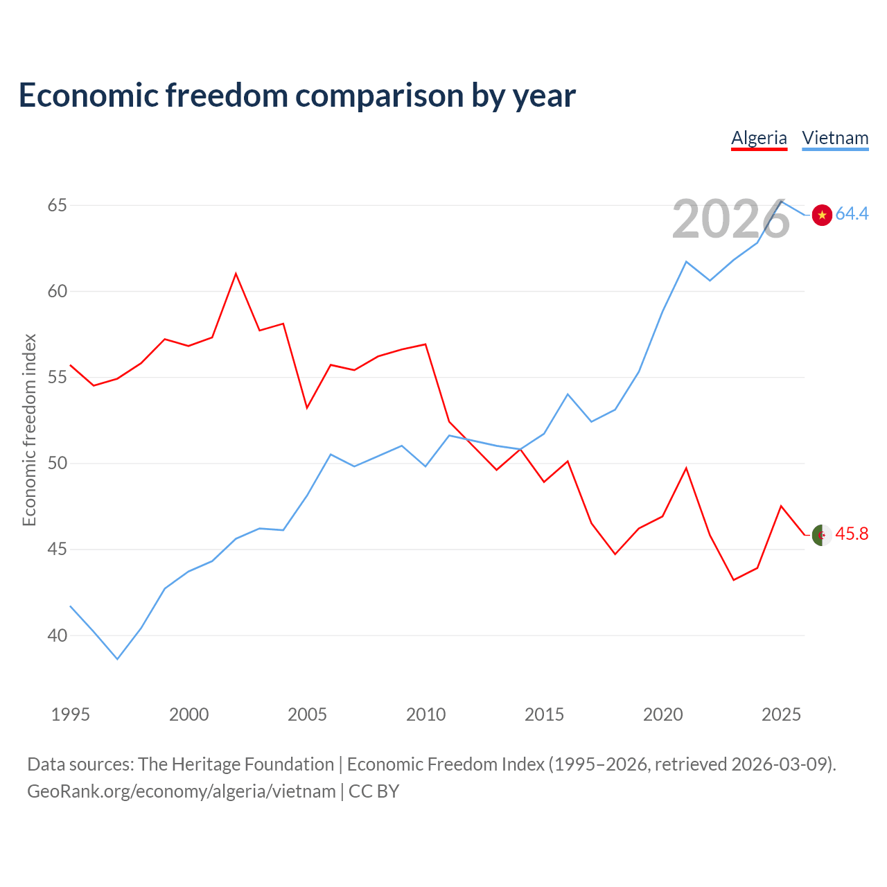 The Economic Freedom Index for Algeria is 45.8, ranking 179/197, compared to 64.4 for Vietnam, ranking 73/197. The chart above displays a comparison of annual changes in economic freedom indexes.