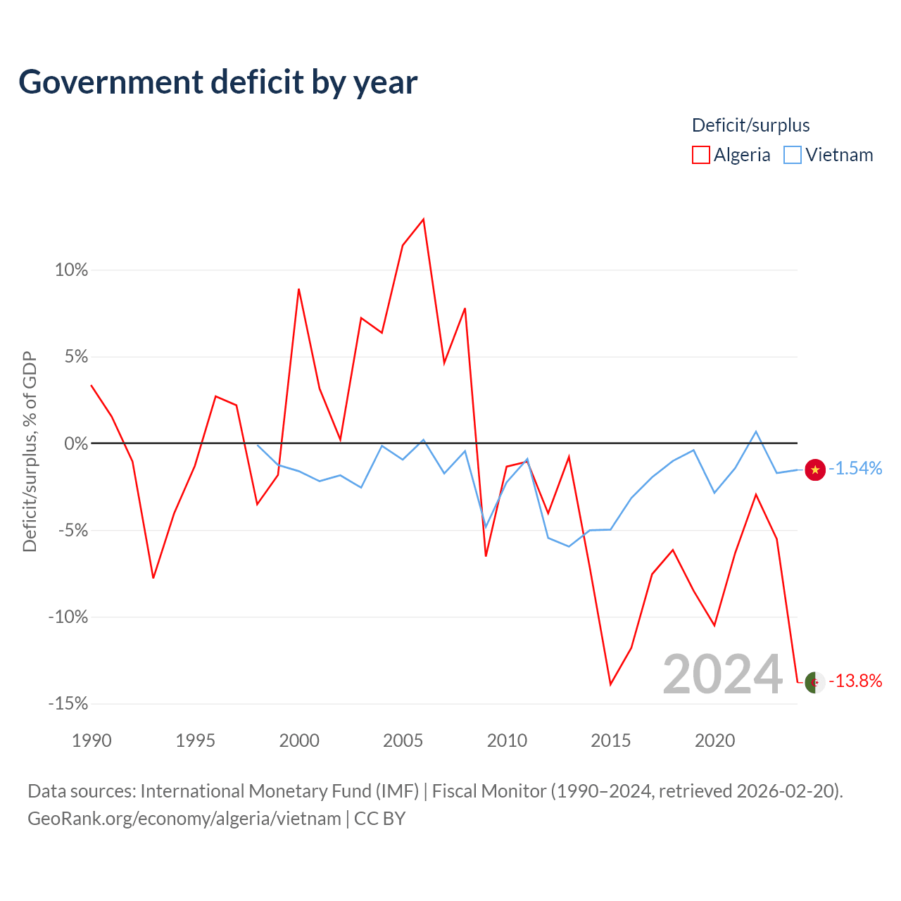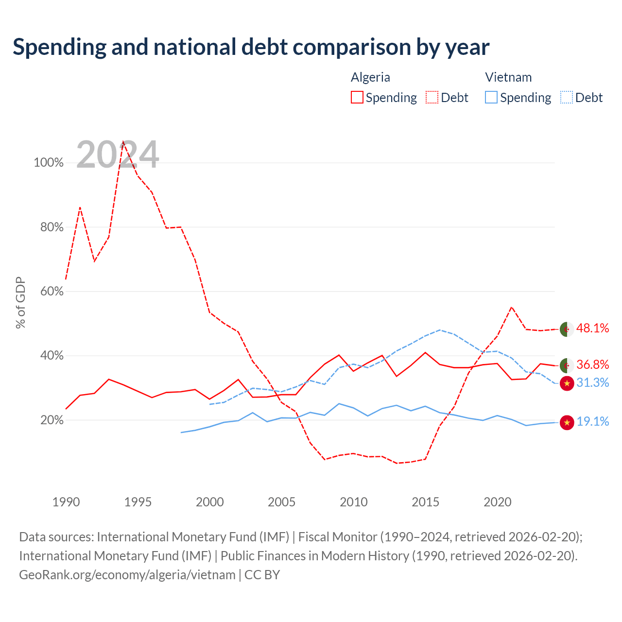 Algeria has $129B in government debt (48.1% of GDP), compared to $149B (31.3% of GDP) in Vietnam.