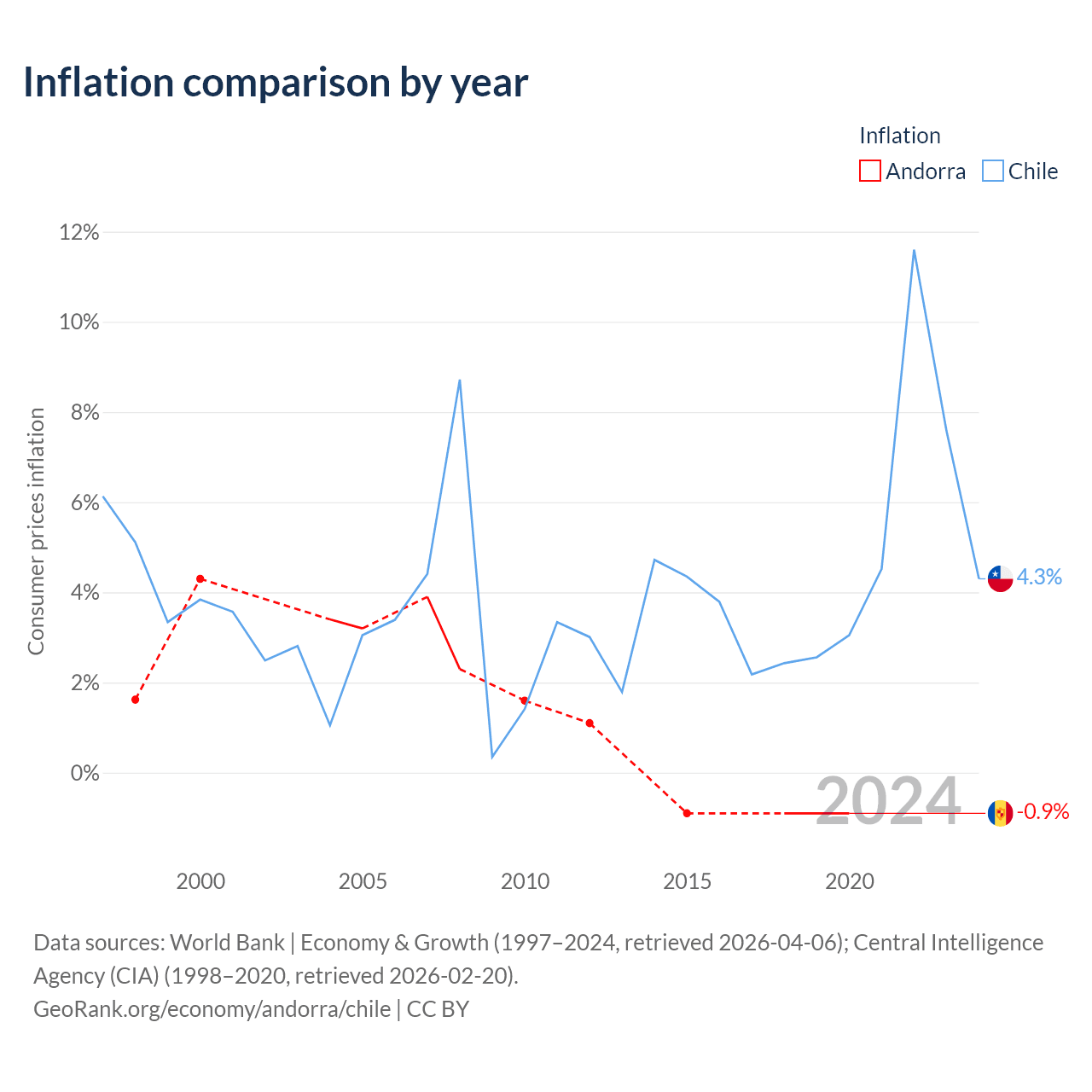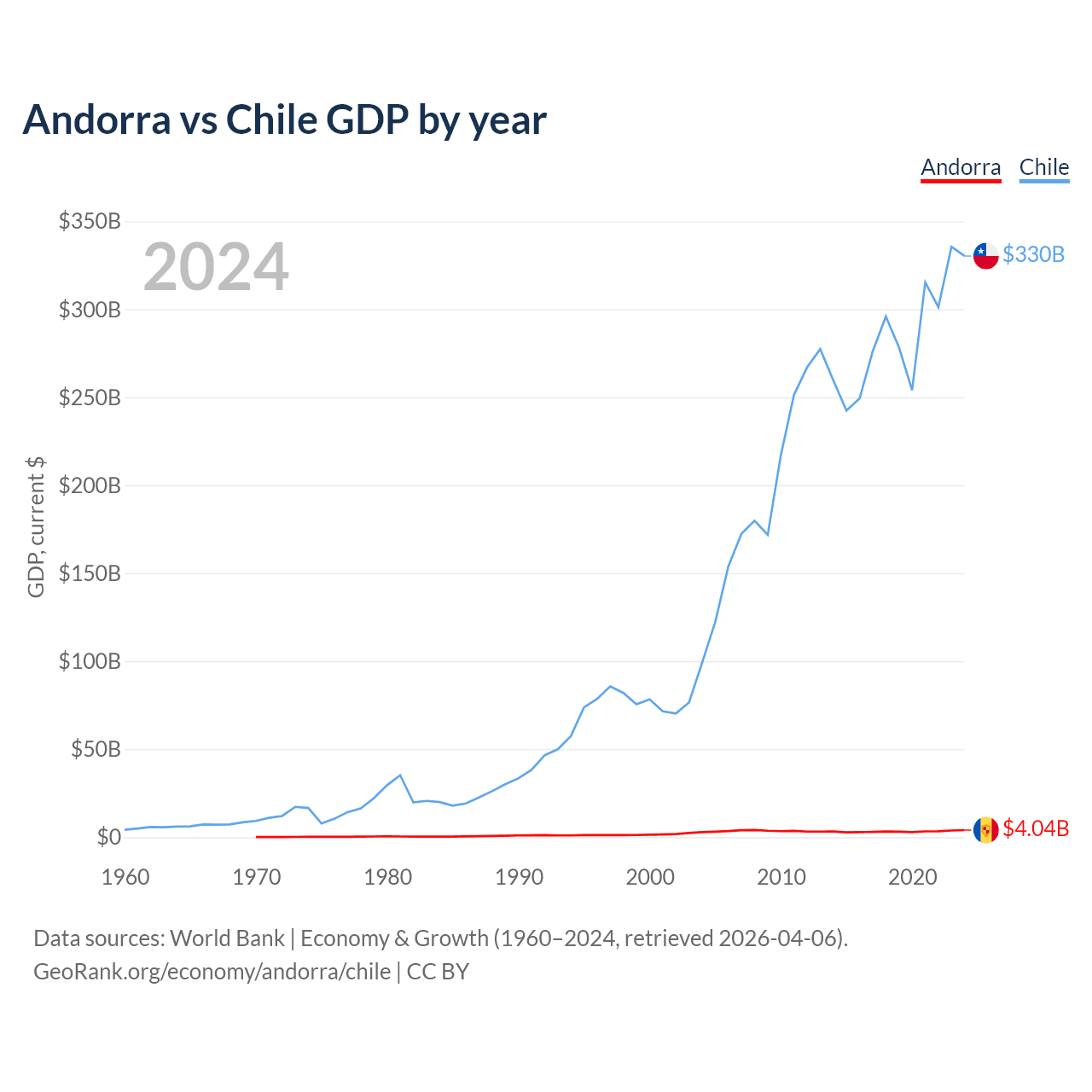 Andorra has a GDP of $4.04B compared to $330B for Chile, ranking 166/197 and 45/197 by economy size, respectively.