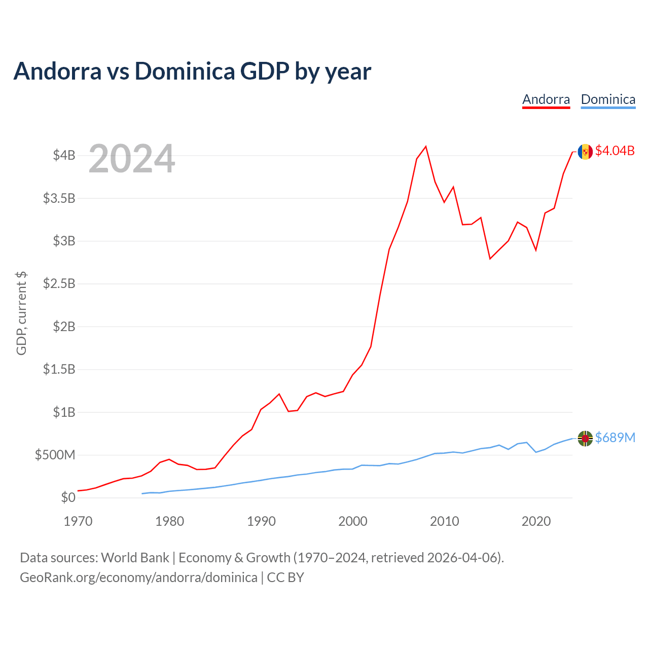 Andorra has a GDP of $4.04B compared to $689M for Dominica, ranking 166/197 and 190/197 by economy size, respectively.
