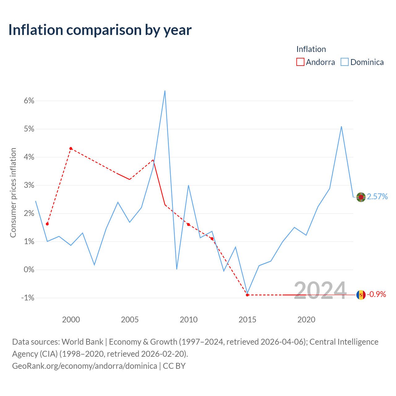 Over the past 23 years, Andorra has recorded an average annual inflation rate of 1.49%, compared with 1.38% in Dominica. In 2020, inflation was -0.9% in Andorra and 2.57% in Dominica.