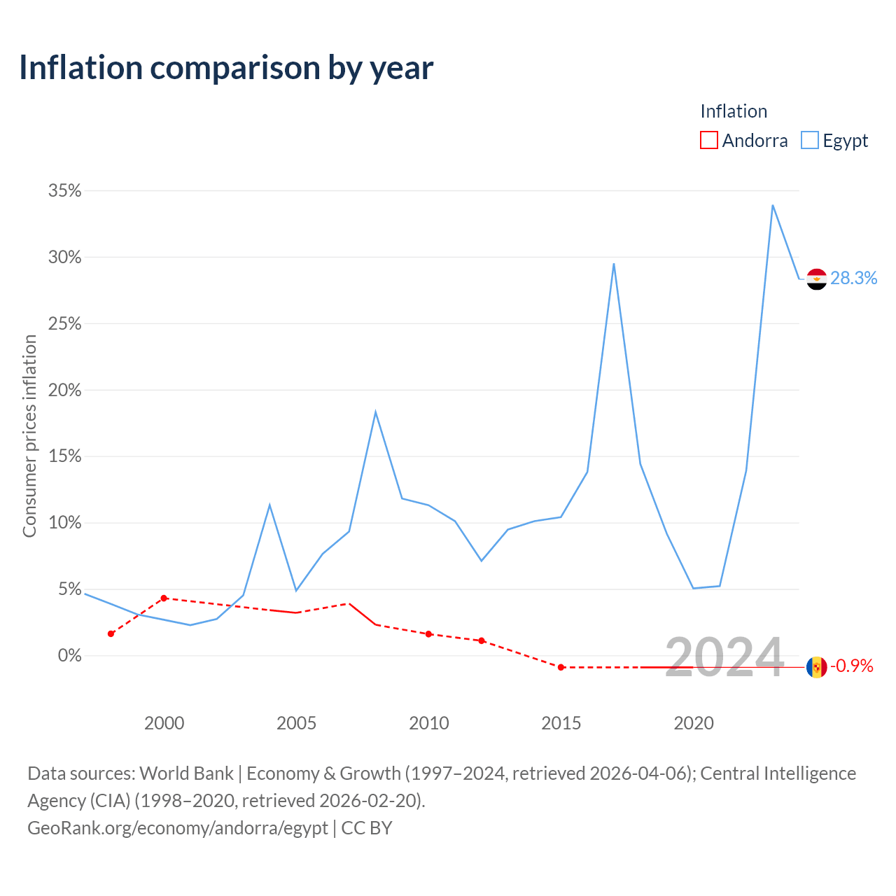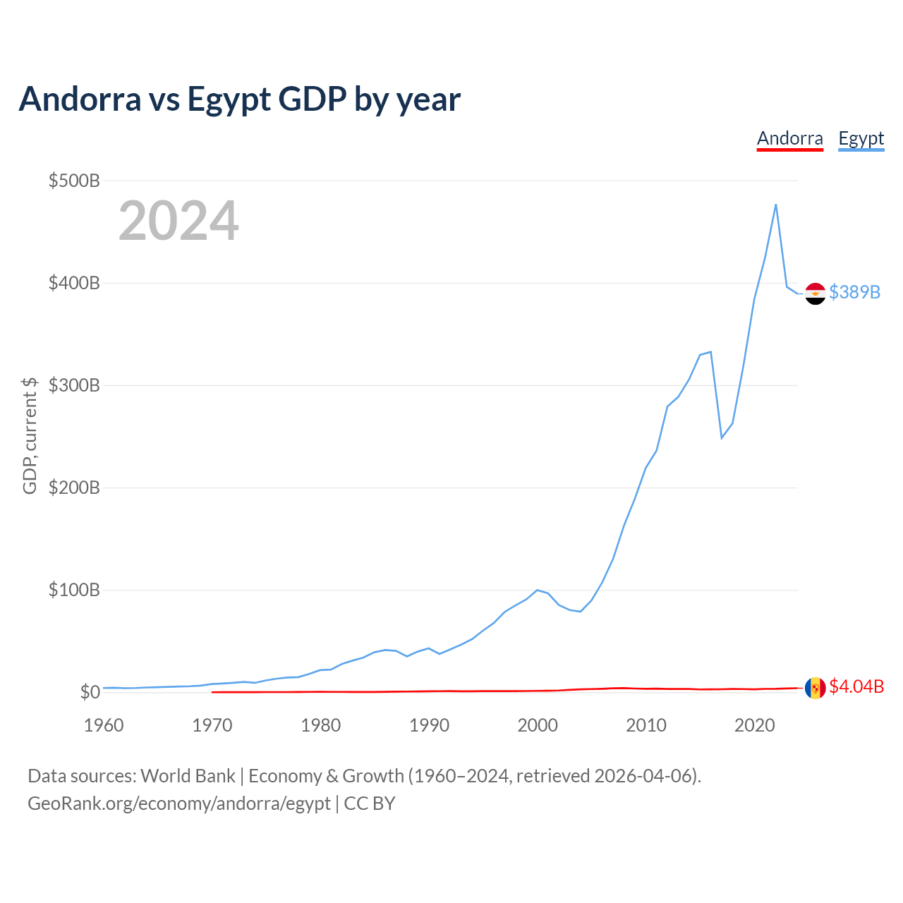 Andorra has a GDP of $4.04B compared to $389B for Egypt, ranking 166/197 and 41/197 by economy size, respectively.