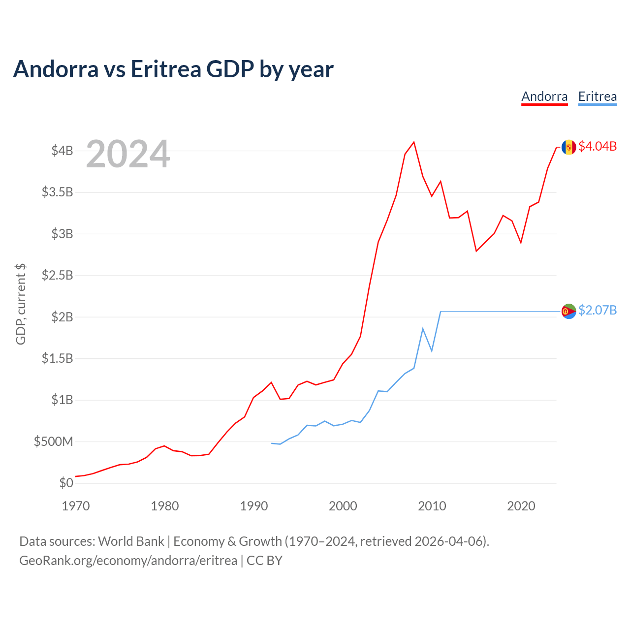 Andorra has a GDP of $4.04B compared to $2.07B for Eritrea, ranking 166/197 and 179/197 by economy size, respectively.