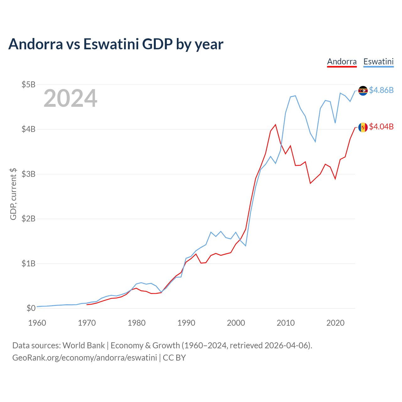 Andorra has a GDP of $4.04B compared to $4.86B for Eswatini, ranking 166/197 and 162/197 by economy size, respectively.