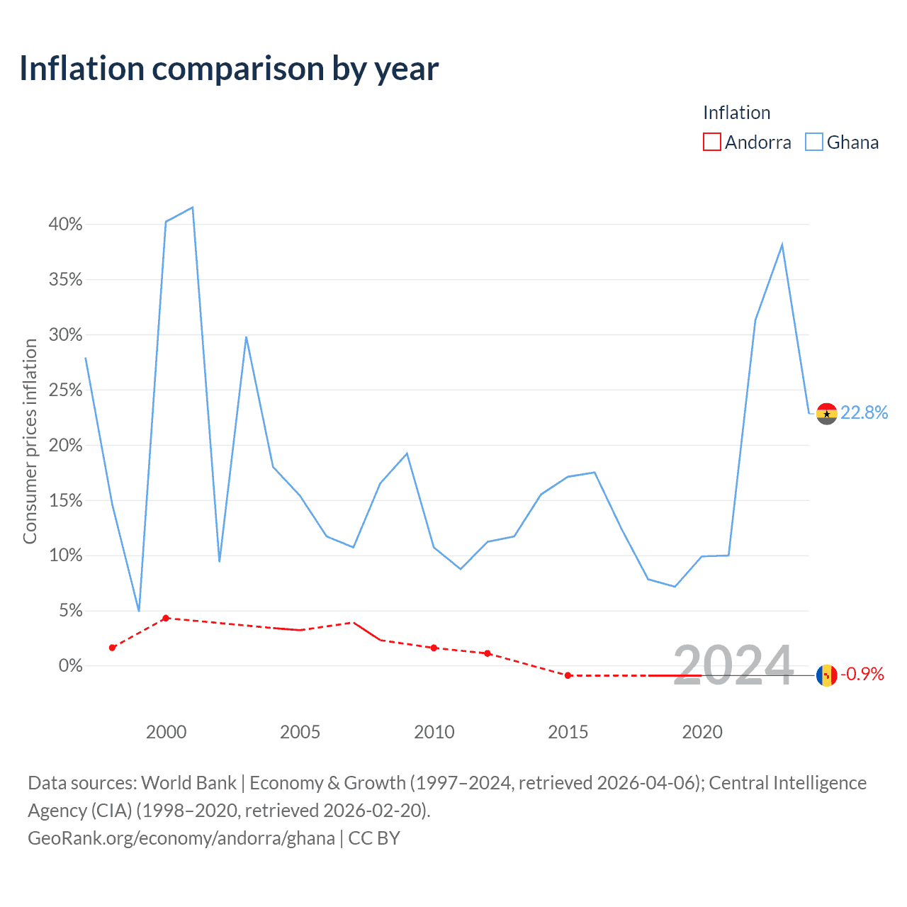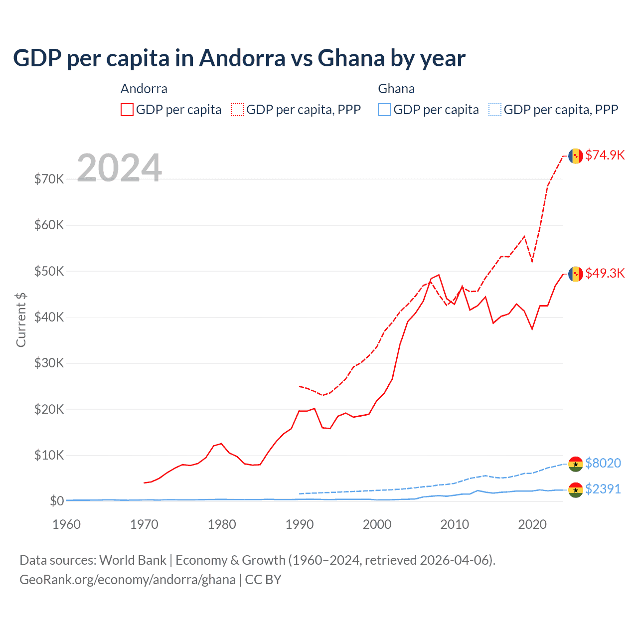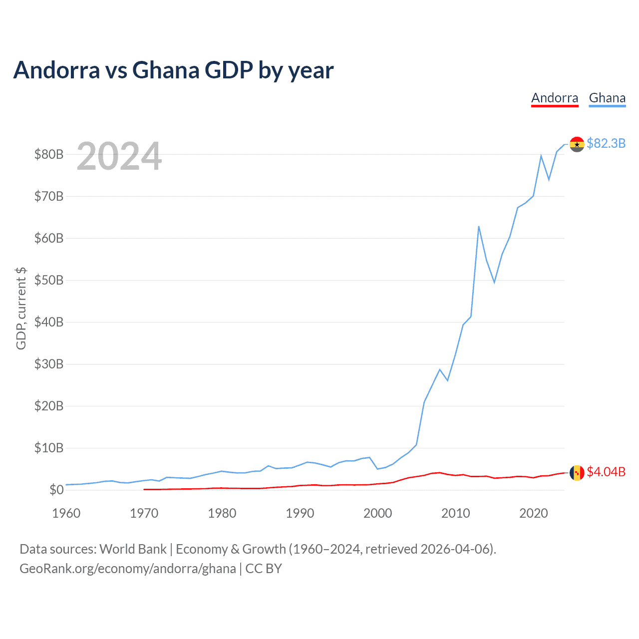 Andorra has a GDP of $4.04B compared to $82.3B for Ghana, ranking 166/197 and 80/197 by economy size, respectively.