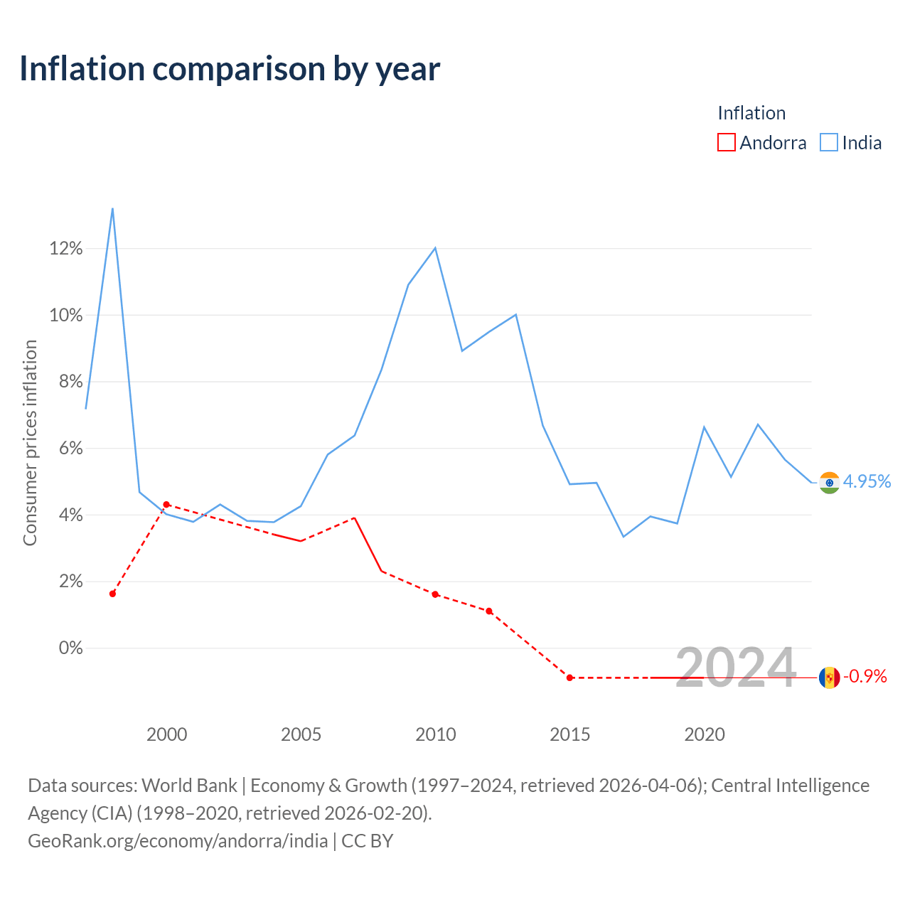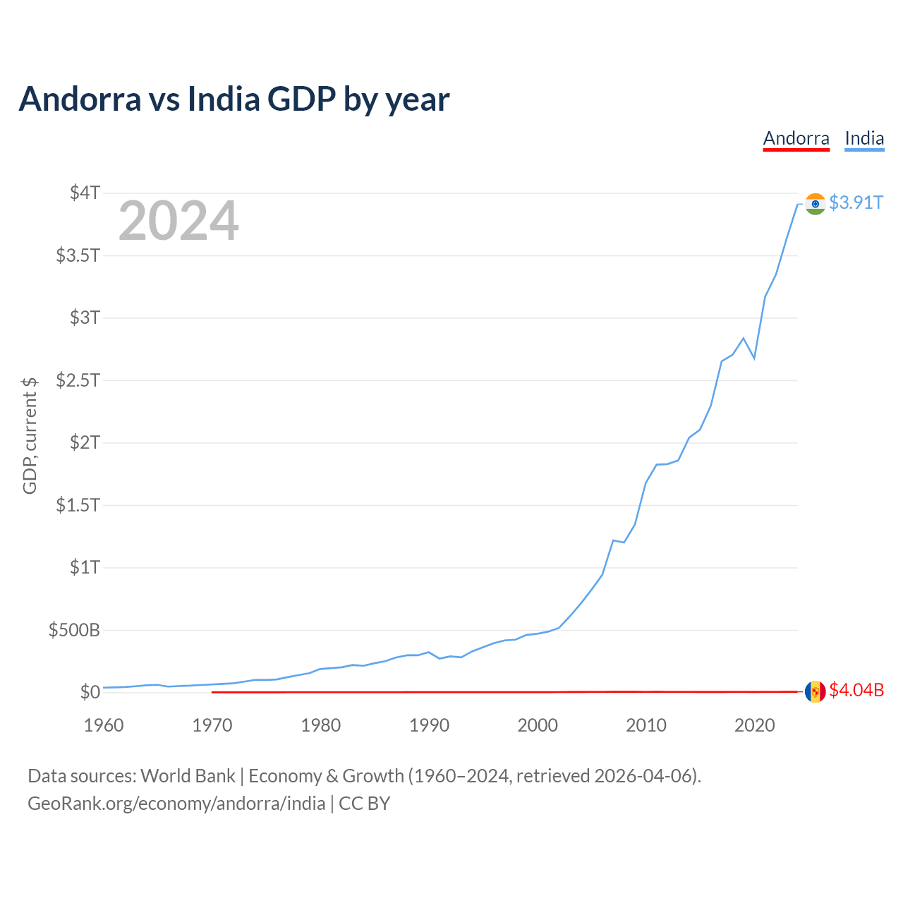 Andorra has a GDP of $4.04B compared to $3.91T for India, ranking 166/197 and 5/197 by economy size, respectively.