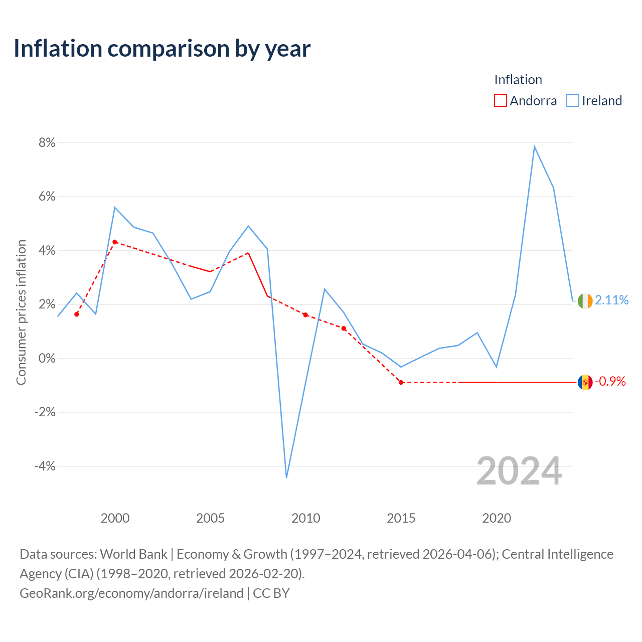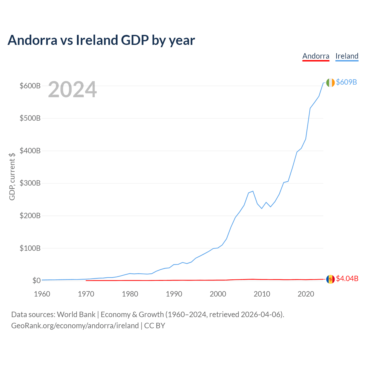 Andorra has a GDP of $4.04B compared to $609B for Ireland, ranking 166/197 and 25/197 by economy size, respectively.