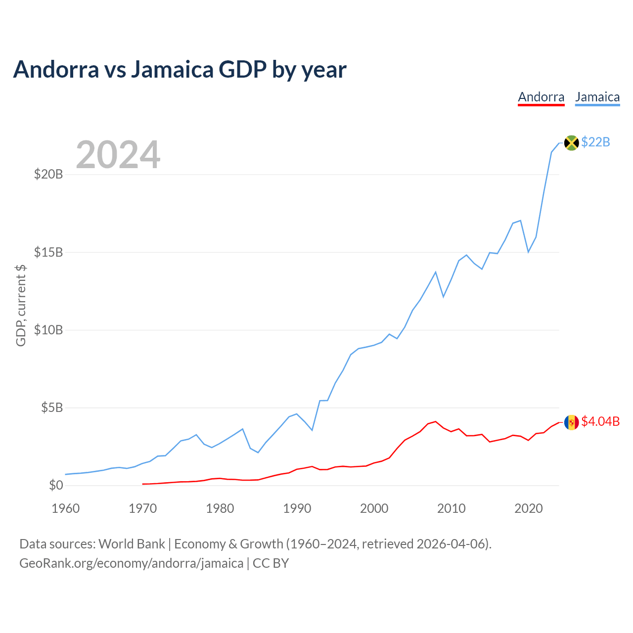 Andorra has a GDP of $4.04B compared to $22B for Jamaica, ranking 166/197 and 124/197 by economy size, respectively.