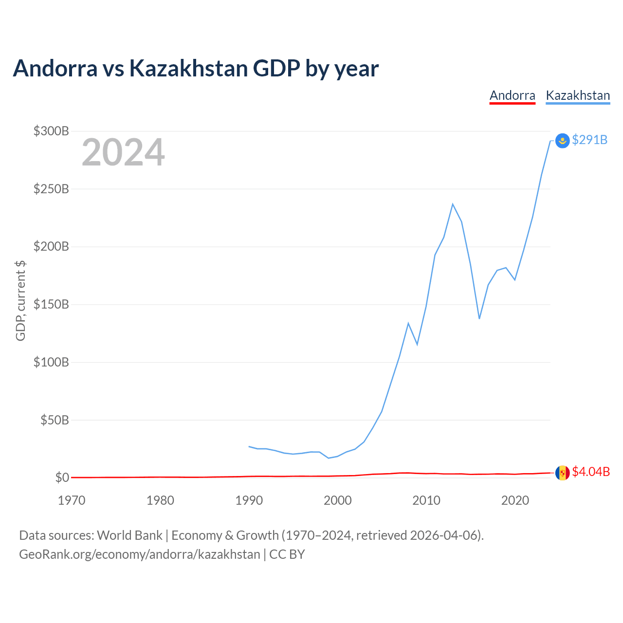 Andorra has a GDP of $4.04B compared to $291B for Kazakhstan, ranking 166/197 and 48/197 by economy size, respectively.