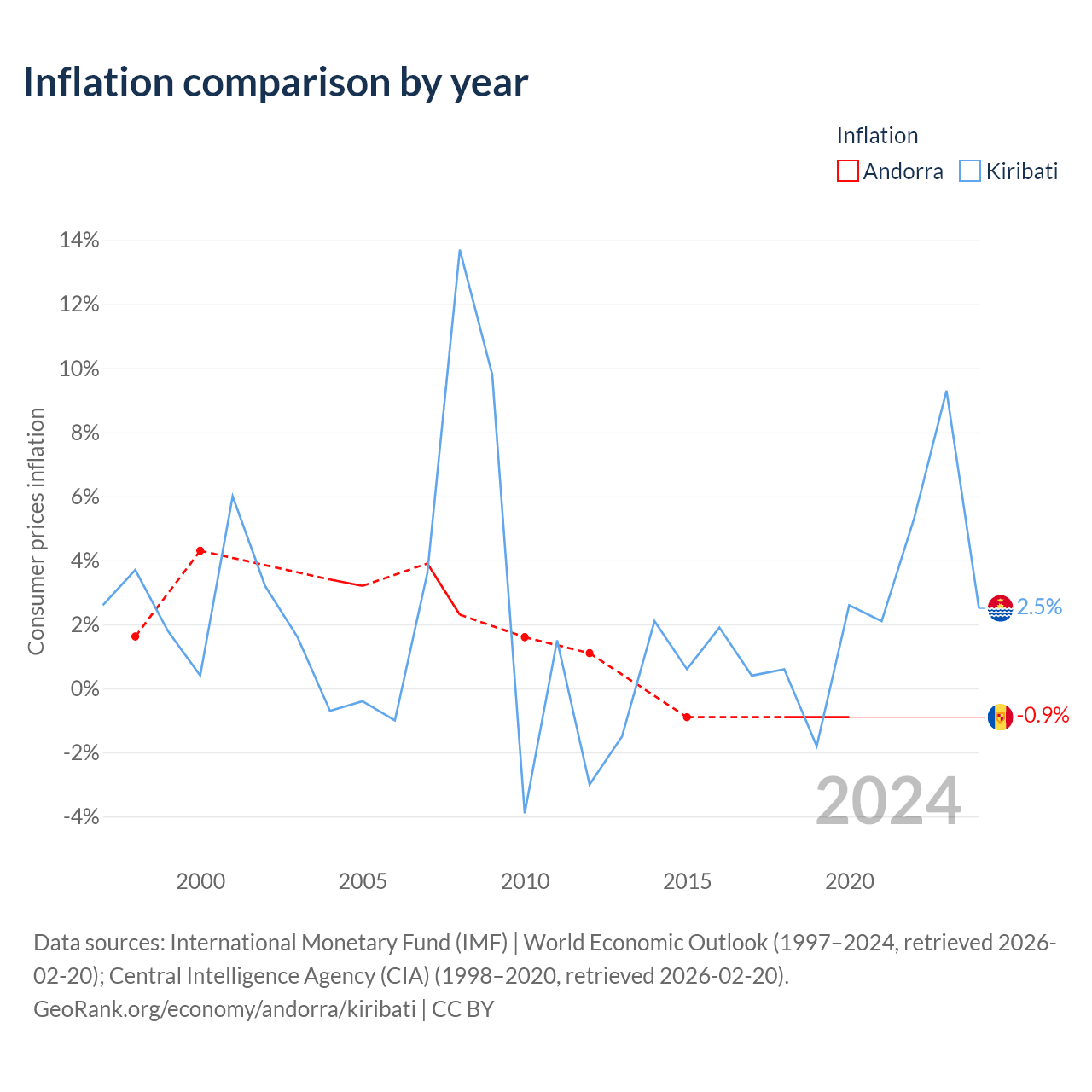 Over the past 23 years, Andorra has recorded an average annual inflation rate of 1.49%, compared with 1.79% in Kiribati. In 2020, inflation was -0.9% in Andorra and 2.5% in Kiribati.