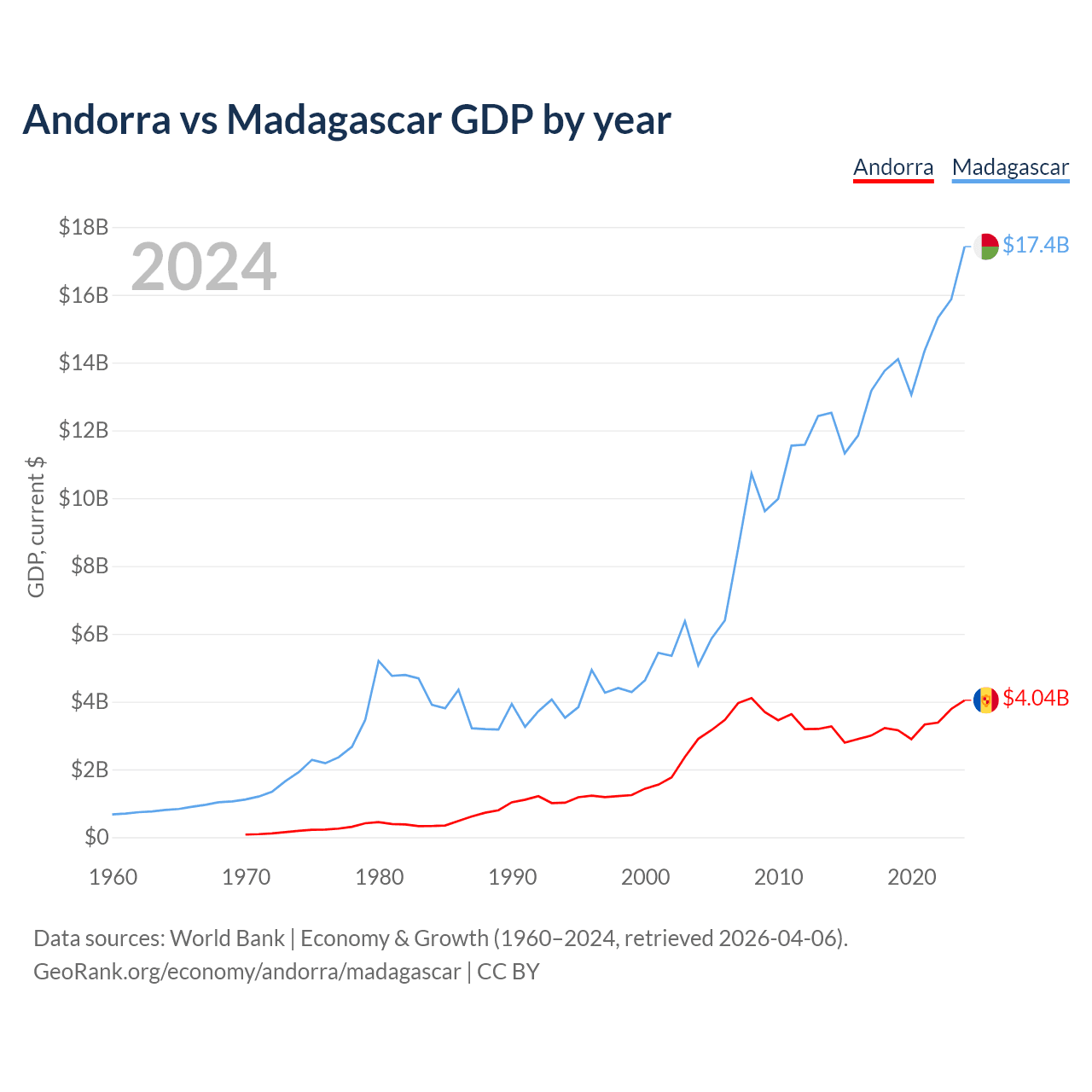 Andorra has a GDP of $4.04B compared to $17.4B for Madagascar, ranking 166/197 and 136/197 by economy size, respectively.