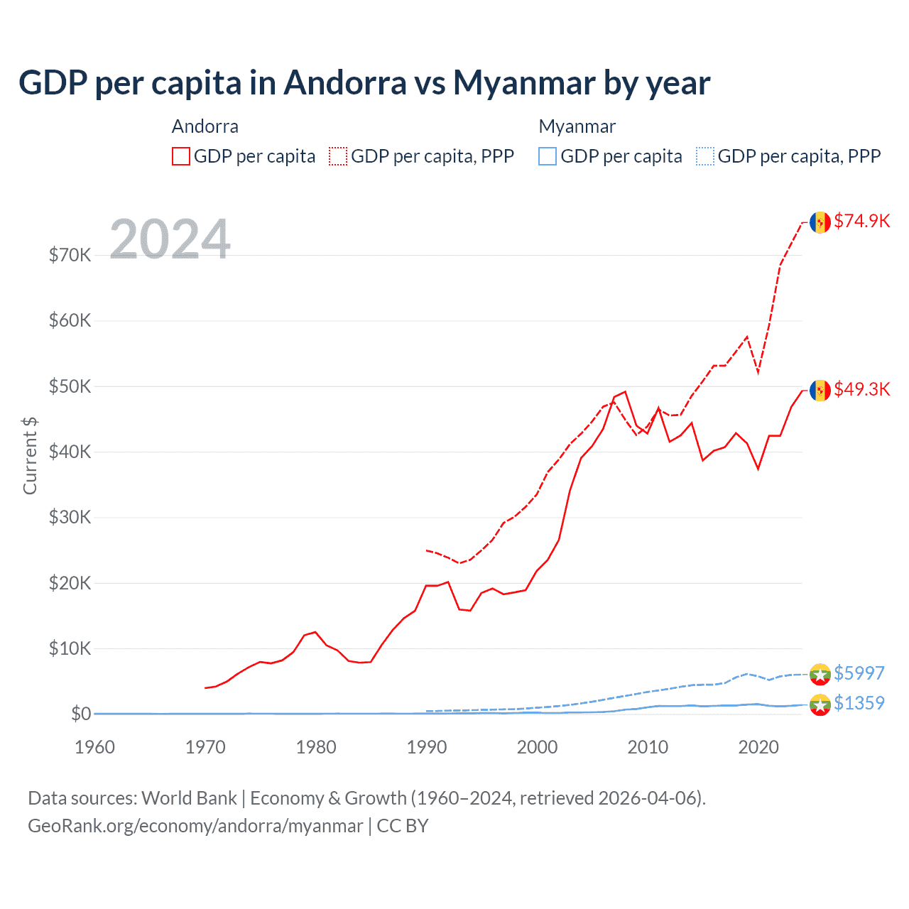 GDP per capita in Andorra vs Myanmar by year