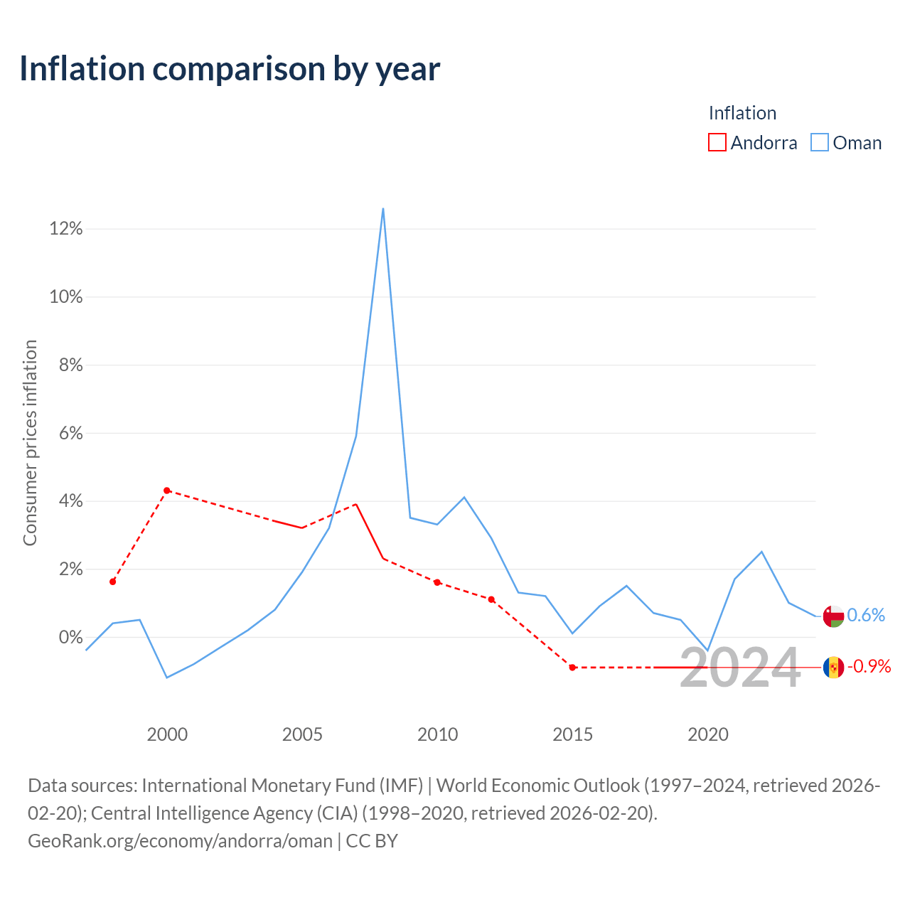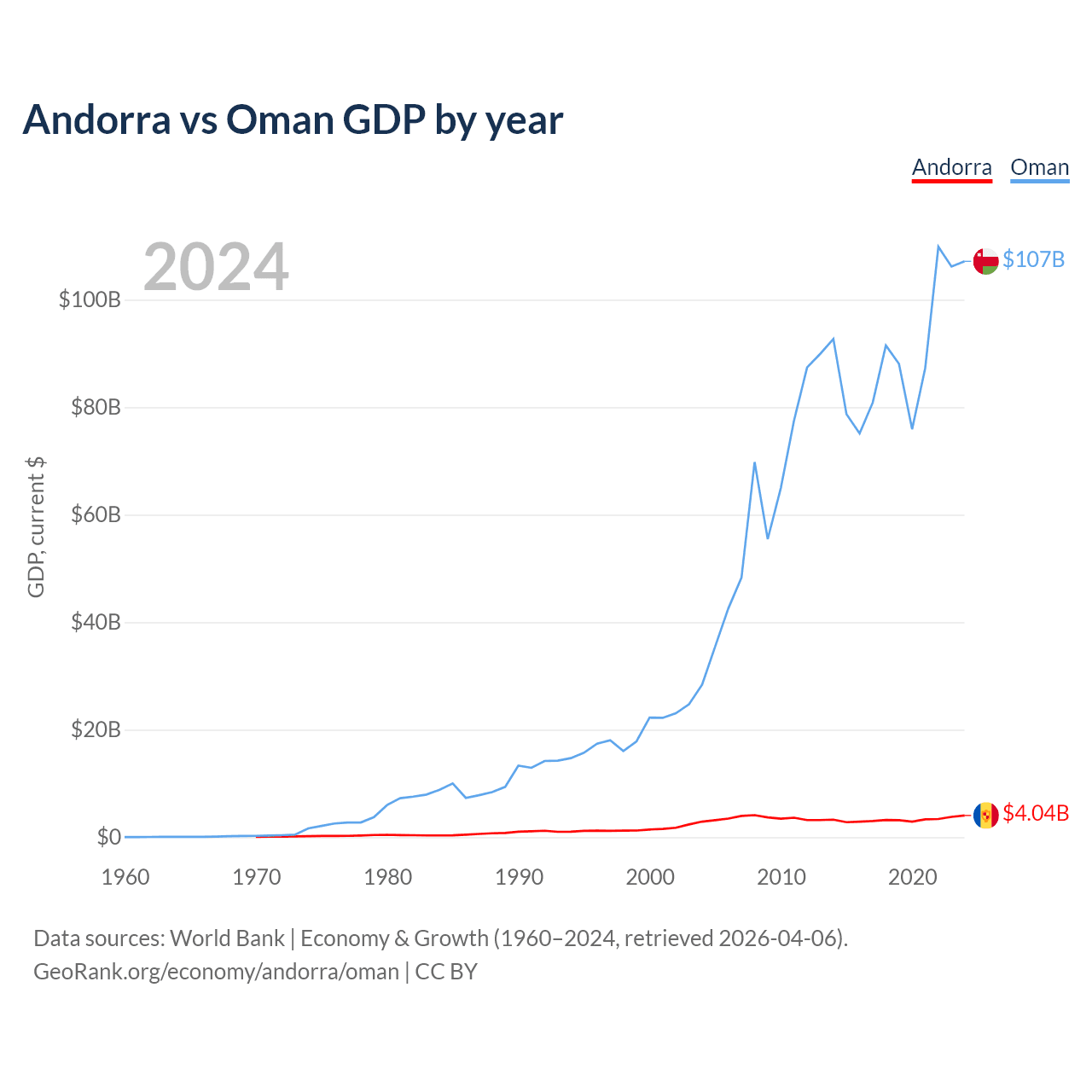 Andorra has a GDP of $4.04B compared to $107B for Oman, ranking 166/197 and 70/197 by economy size, respectively.