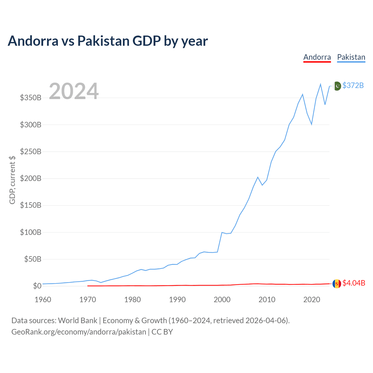 Andorra has a GDP of $4.04B compared to $372B for Pakistan, ranking 166/197 and 43/197 by economy size, respectively.