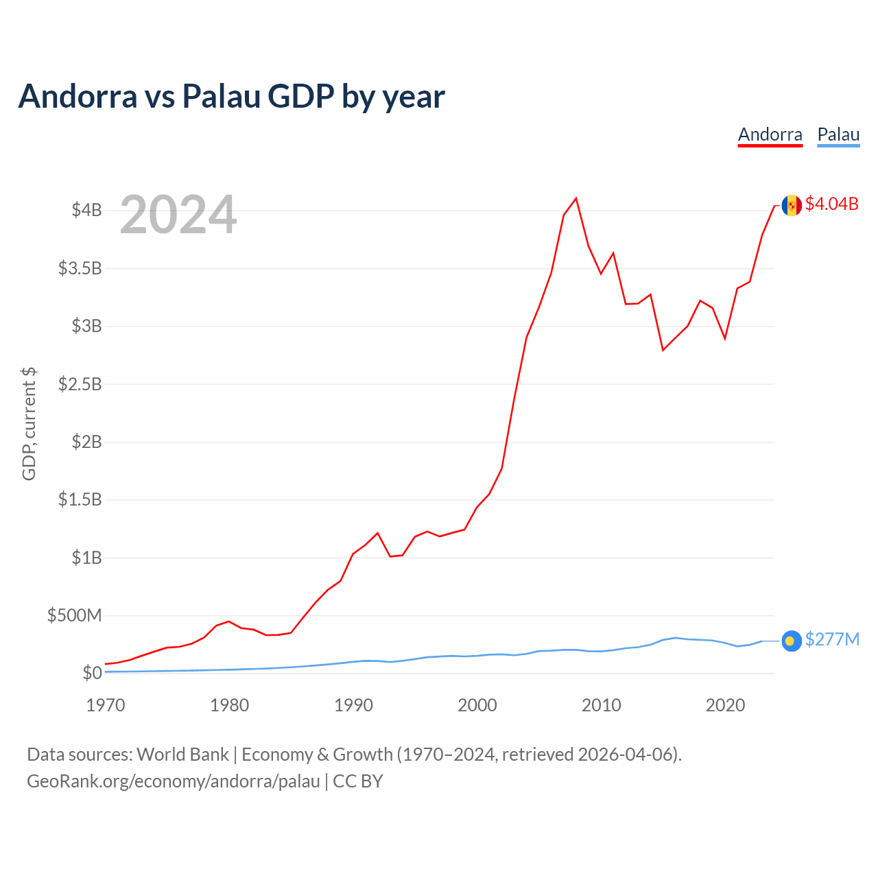 Andorra has a GDP of $4.04B compared to $277M for Palau, ranking 166/197 and 194/197 by economy size, respectively.