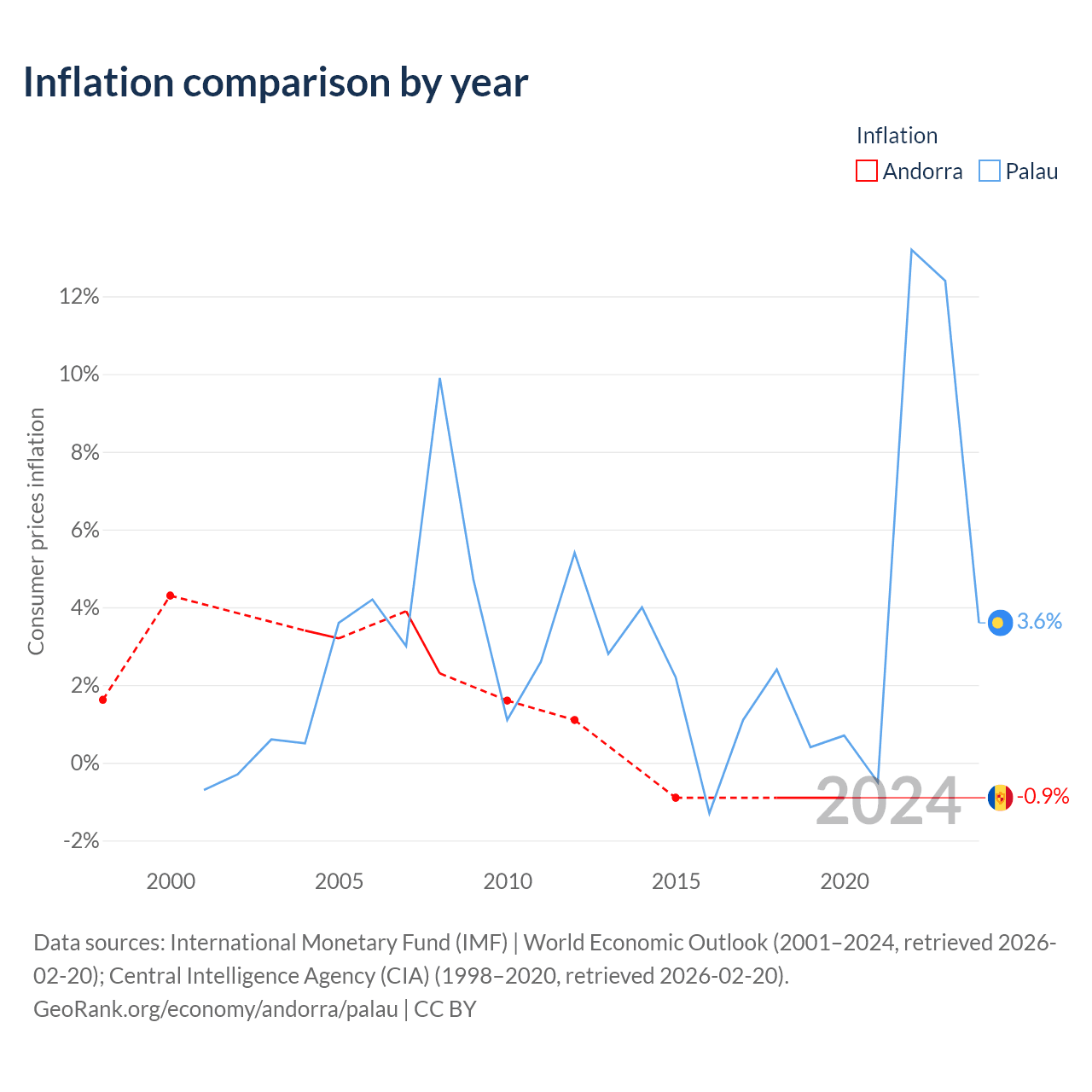 Over the past 20 years, Andorra has recorded an average annual inflation rate of 1.19%, compared with 2.35% in Palau. In 2020, inflation was -0.9% in Andorra and 3.6% in Palau.