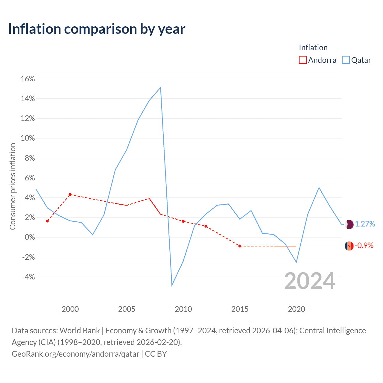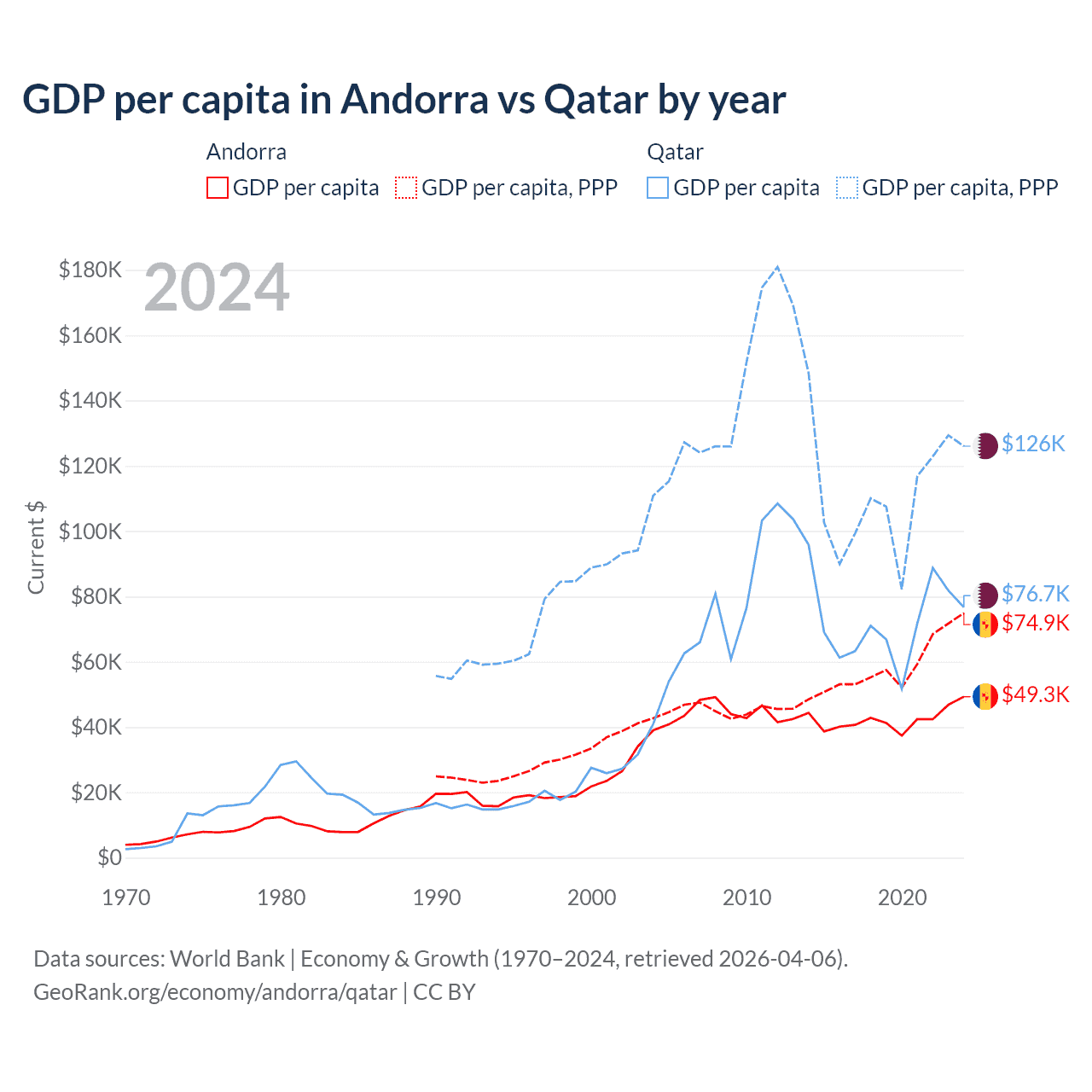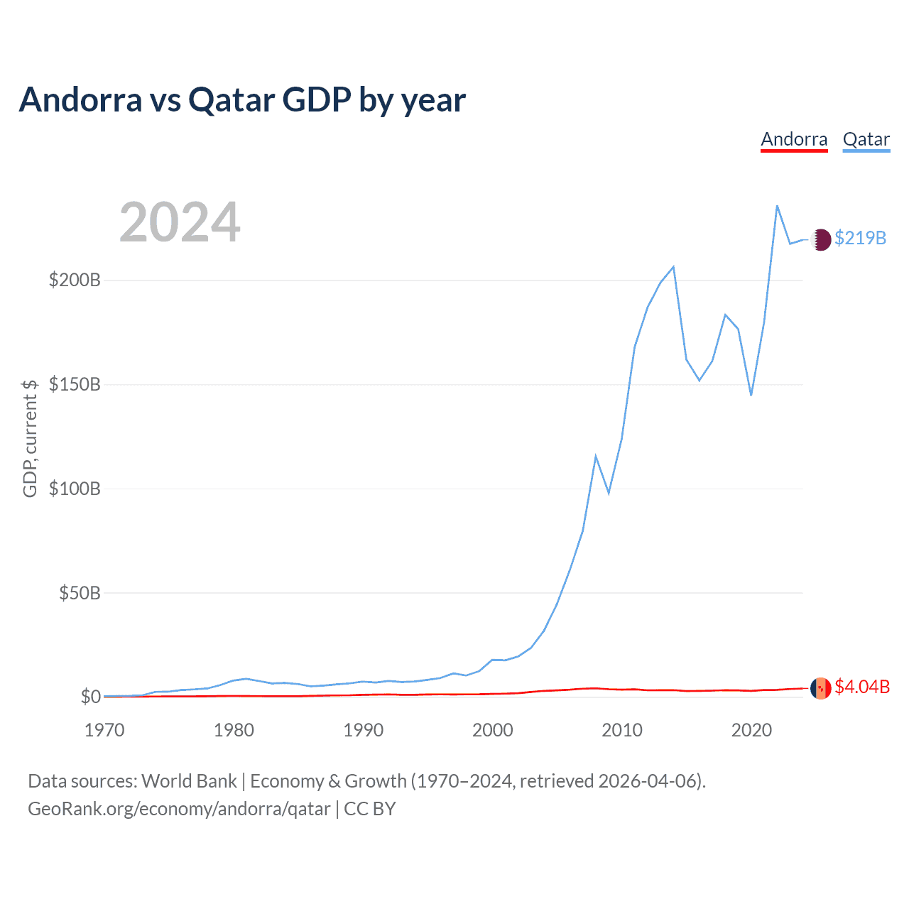 Andorra has a GDP of $4.04B compared to $219B for Qatar, ranking 166/197 and 56/197 by economy size, respectively.