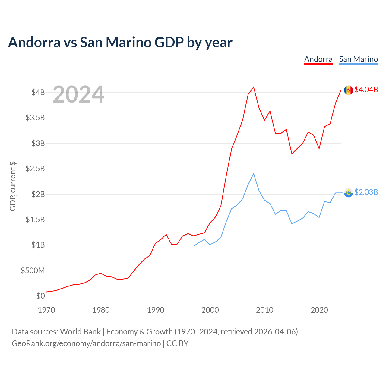Andorra has a GDP of $4.04B compared to $2.03B for San Marino, ranking 166/197 and 180/197 by economy size, respectively.