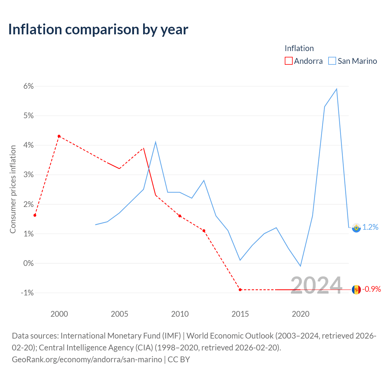 Over the past 18 years, Andorra has recorded an average annual inflation rate of 1.19%, compared with 1.61% in San Marino. In 2020, inflation was -0.9% in Andorra and 1.2% in San Marino.