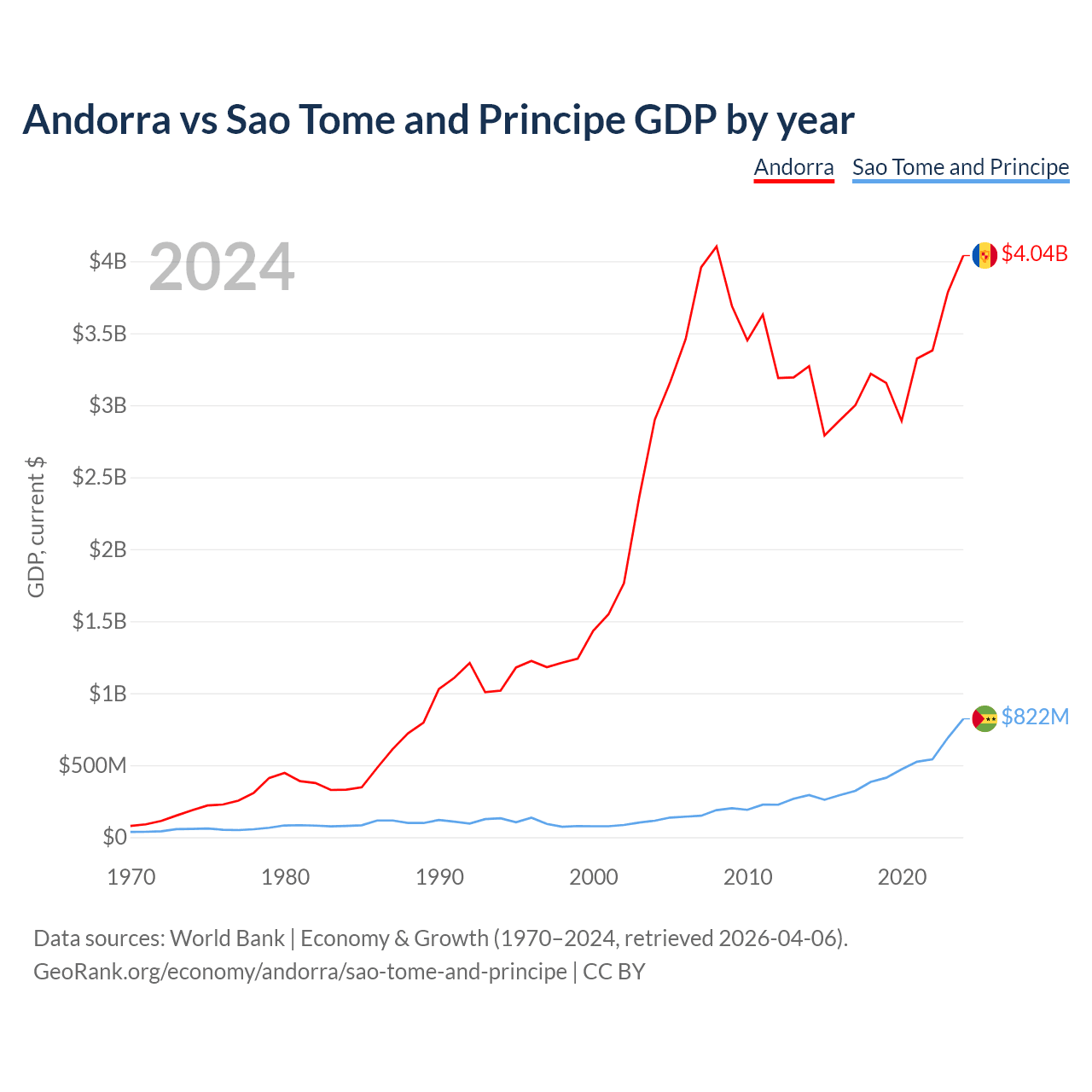Andorra has a GDP of $4.04B compared to $822M for Sao Tome and Principe, ranking 166/197 and 189/197 by economy size, respectively.