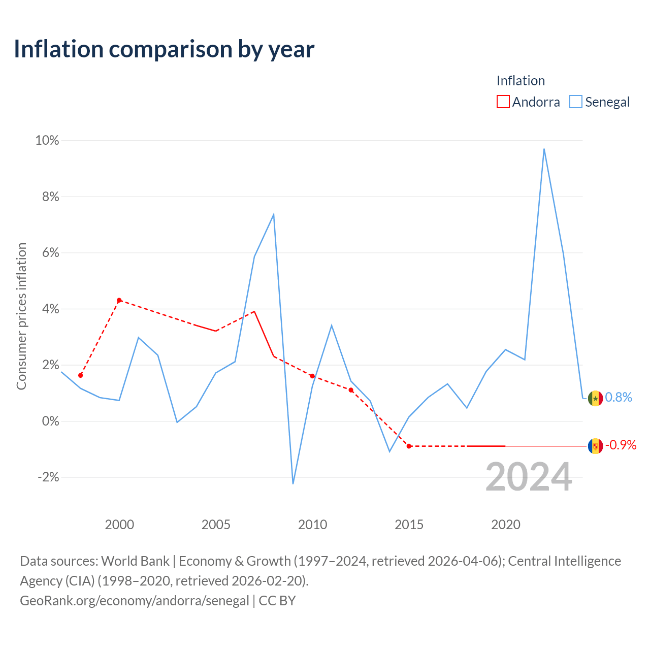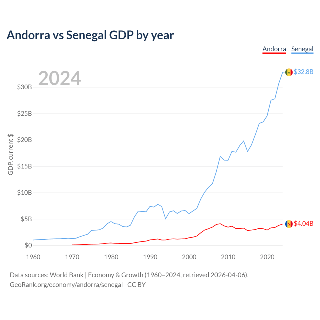 Andorra has a GDP of $4.04B compared to $32.8B for Senegal, ranking 166/197 and 109/197 by economy size, respectively.