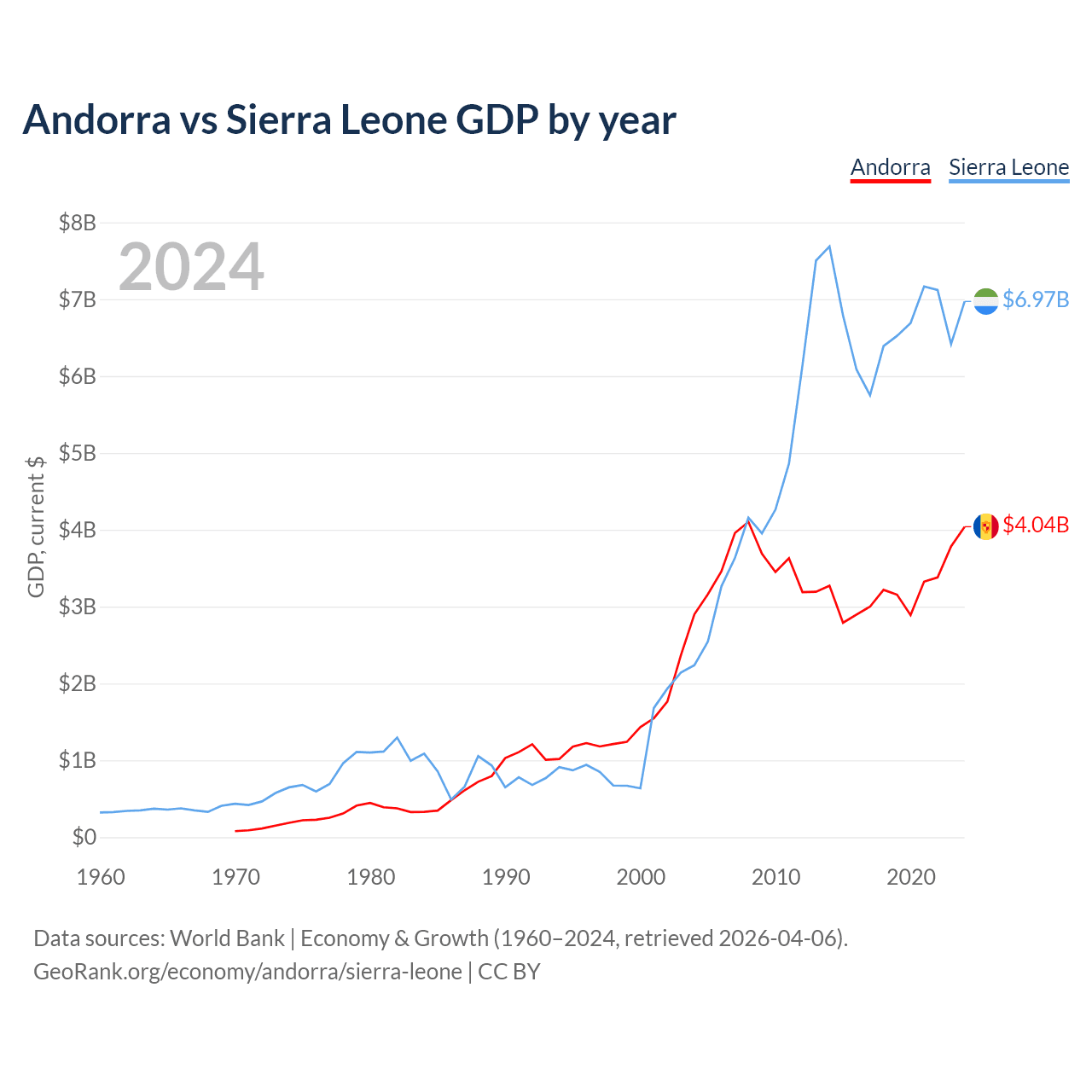 Andorra has a GDP of $4.04B compared to $6.97B for Sierra Leone, ranking 166/197 and 160/197 by economy size, respectively.