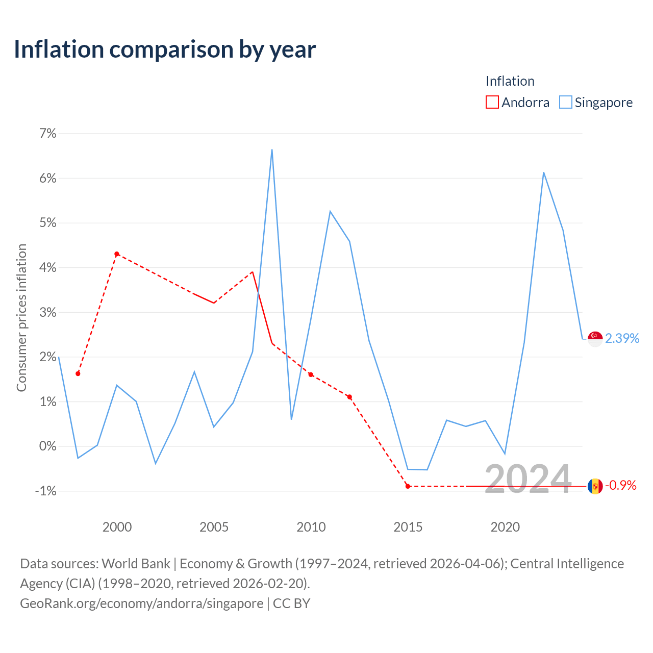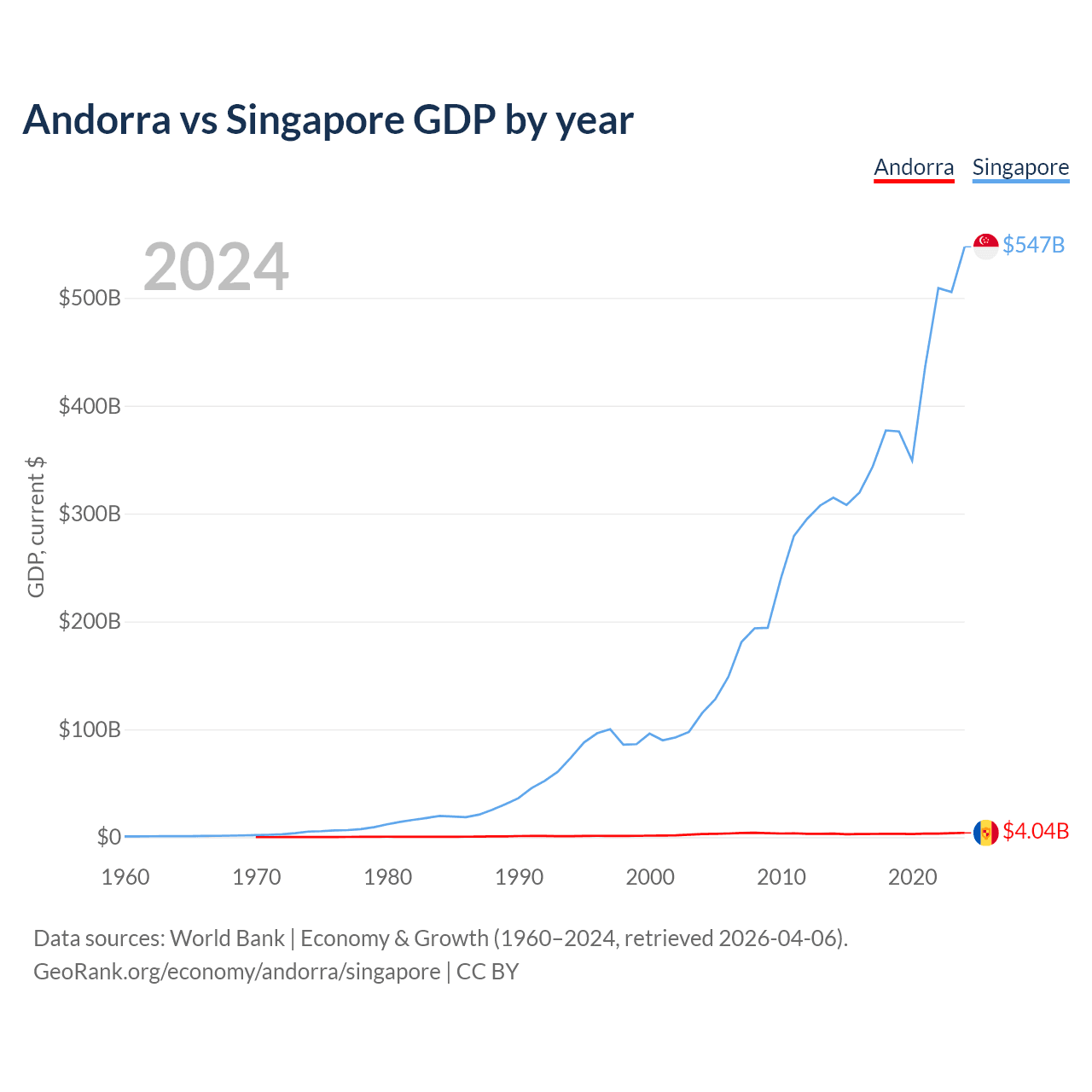 Andorra has a GDP of $4.04B compared to $547B for Singapore, ranking 166/197 and 28/197 by economy size, respectively.