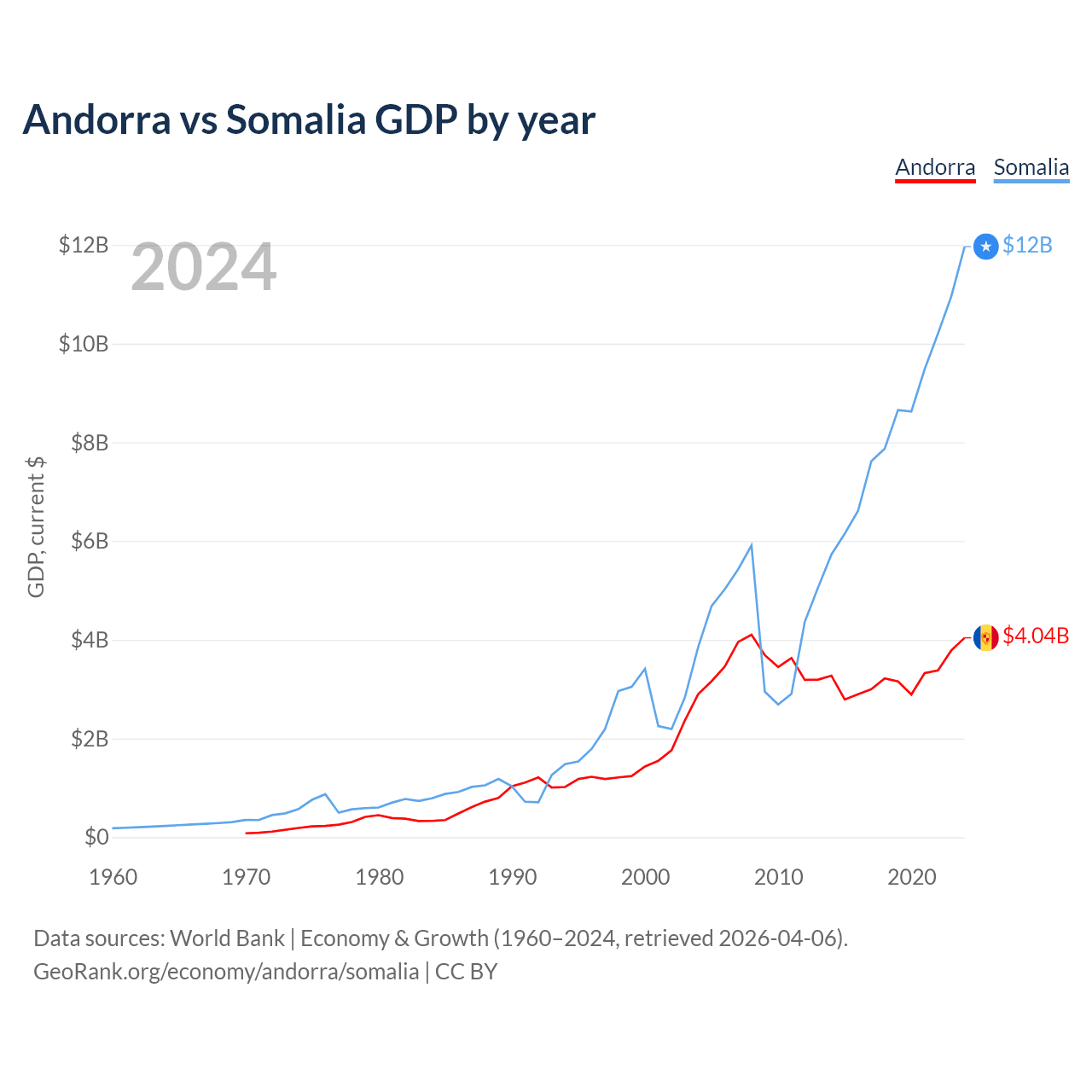 Andorra has a GDP of $4.04B compared to $12B for Somalia, ranking 166/197 and 150/197 by economy size, respectively.