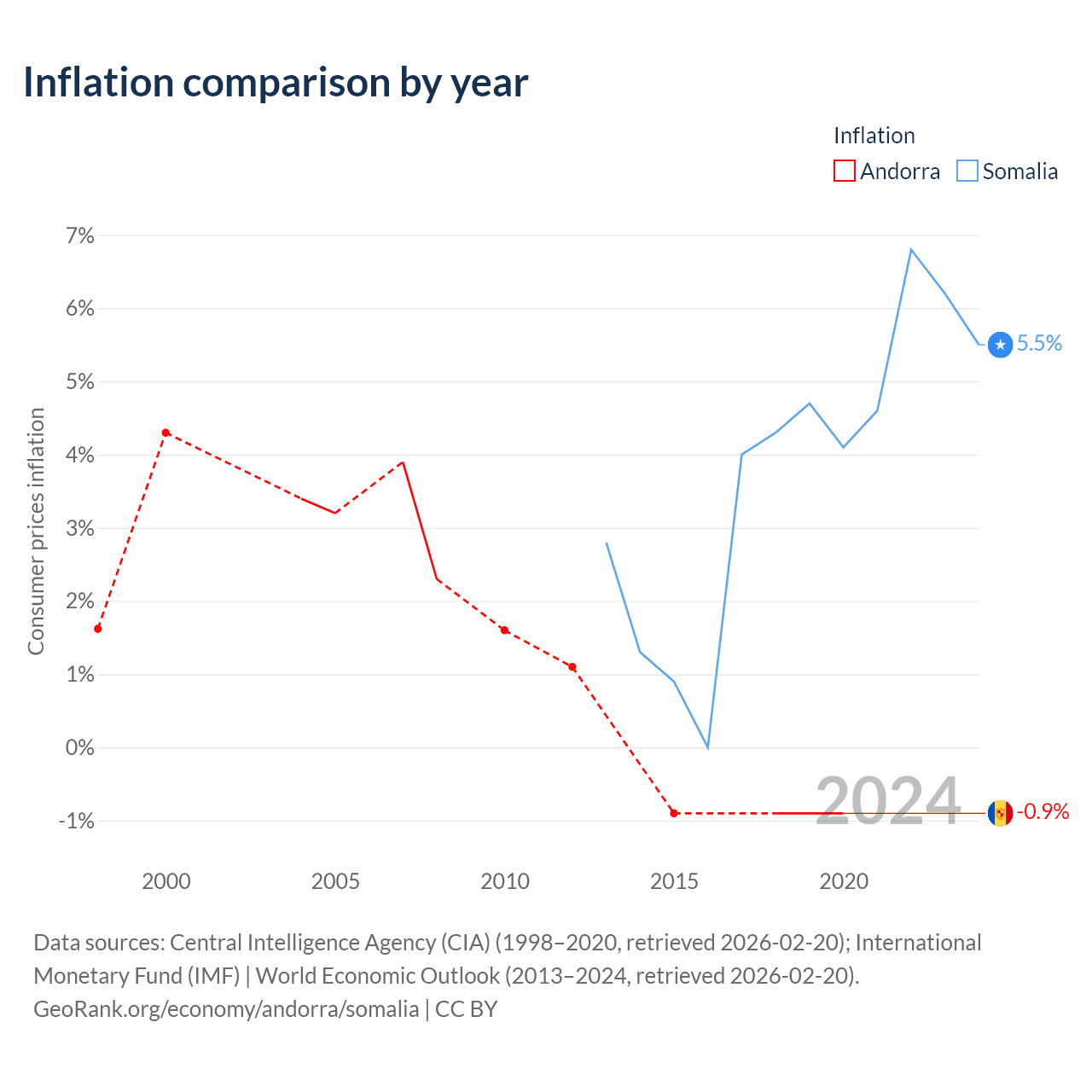Over the past 8 years, Andorra has recorded an average annual inflation rate of -0.9%, compared with 2.76% in Somalia. In 2020, inflation was -0.9% in Andorra and 5.5% in Somalia.