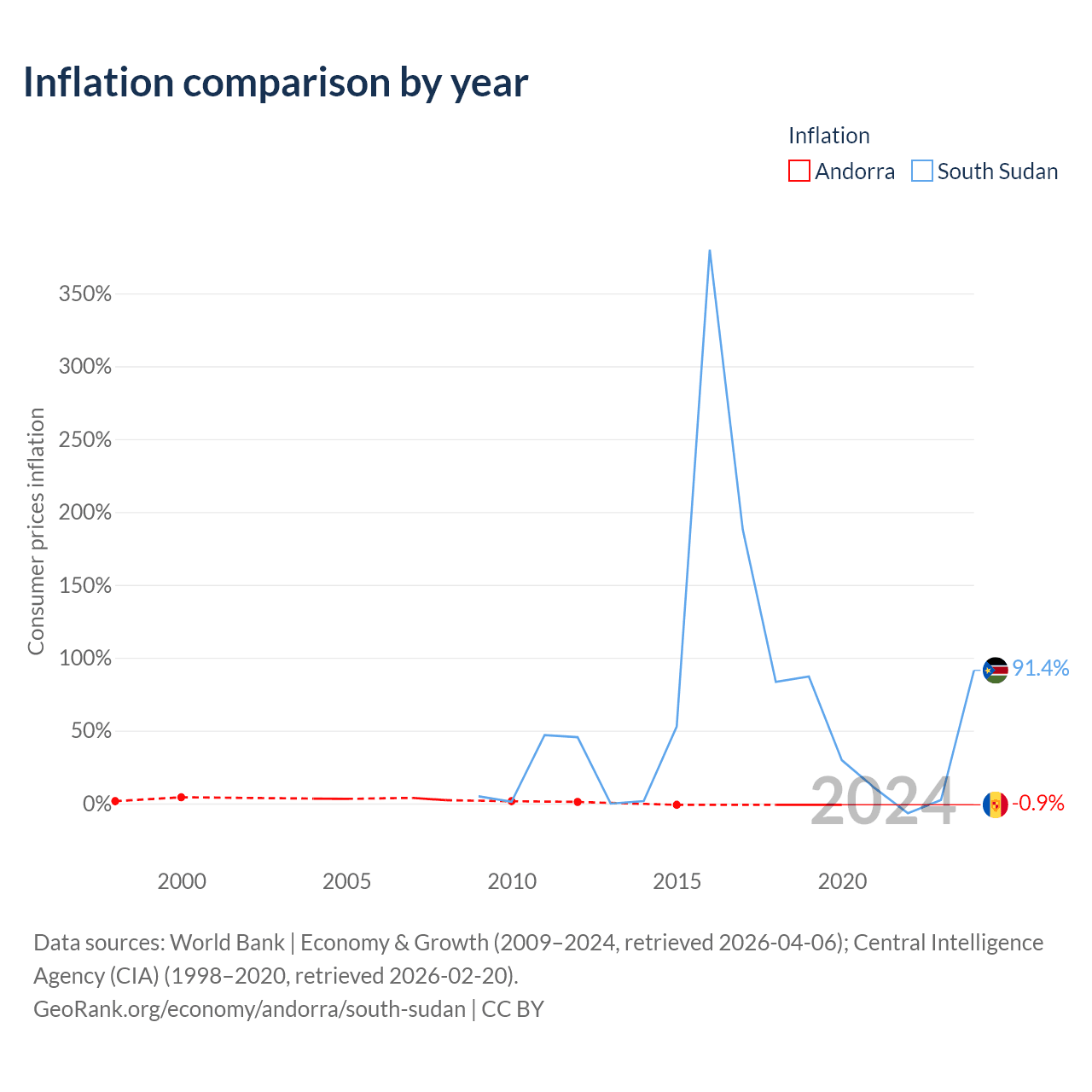 Over the past 12 years, Andorra has recorded an average annual inflation rate of -0.15%, compared with 76.8% in South Sudan. In 2020, inflation was -0.9% in Andorra and 91.4% in South Sudan.