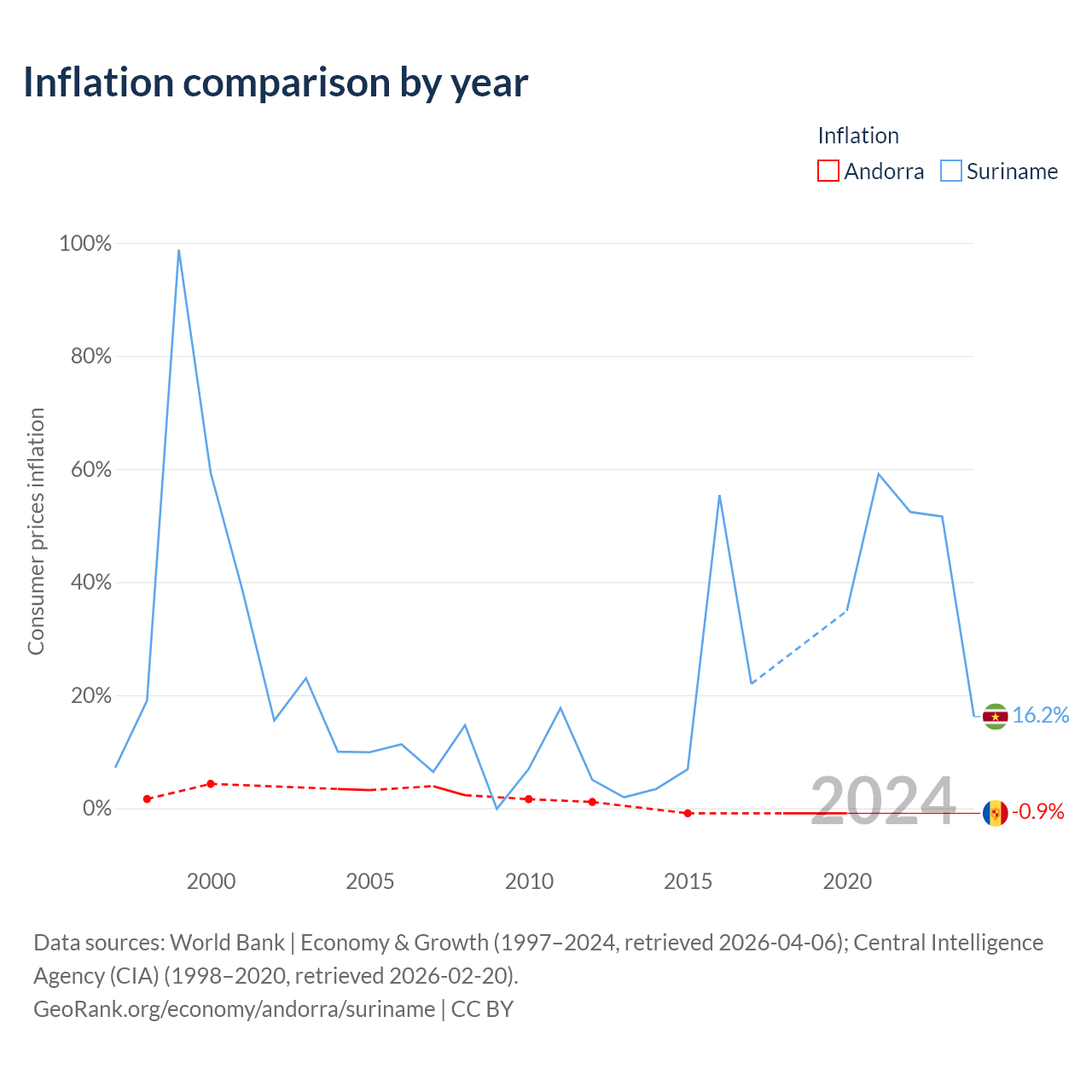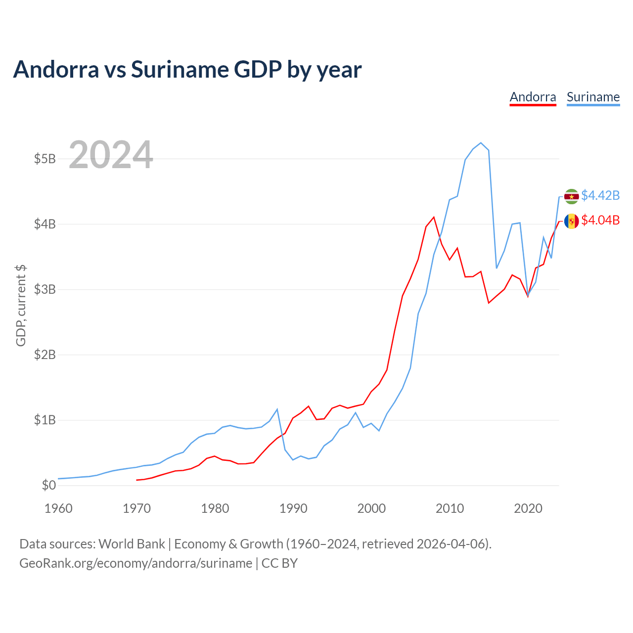 Andorra has a GDP of $4.04B compared to $4.42B for Suriname, ranking 166/197 and 164/197 by economy size, respectively.