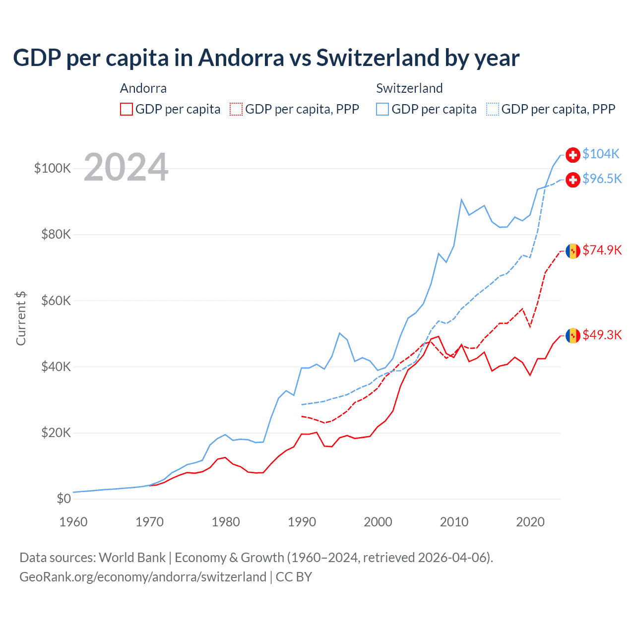 Andorra has a GDP of $4.04B compared to $937B for Switzerland, ranking 166/197 and 20/197 by economy size, respectively.