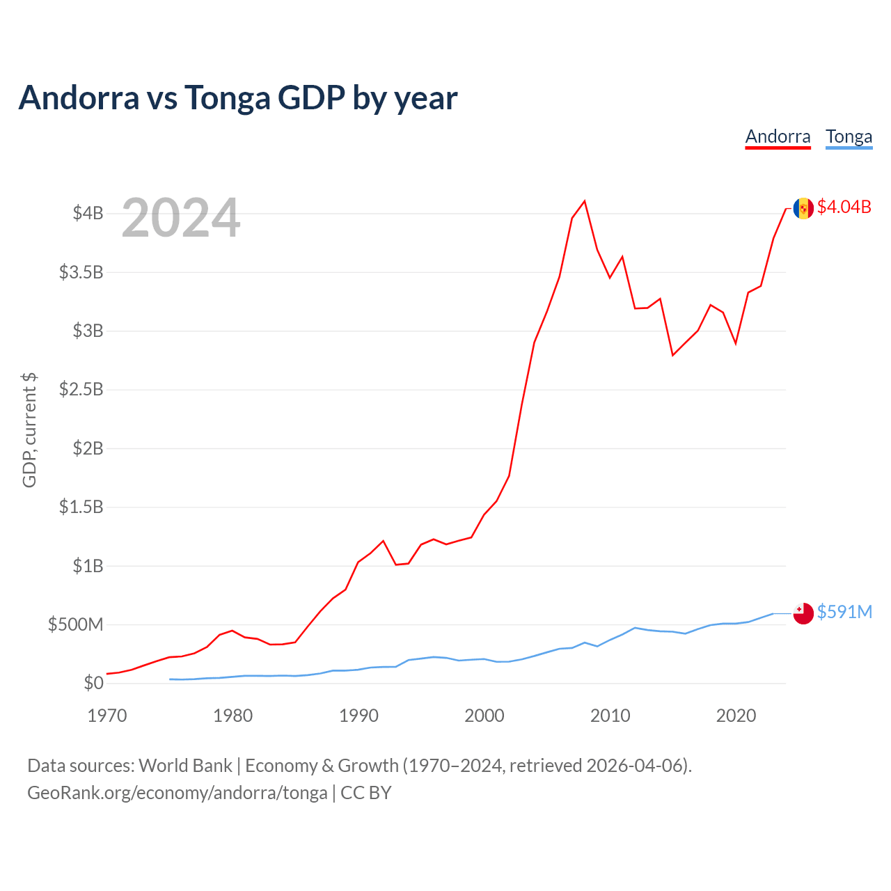 Andorra has a GDP of $4.04B compared to $591M for Tonga, ranking 166/197 and 191/197 by economy size, respectively.