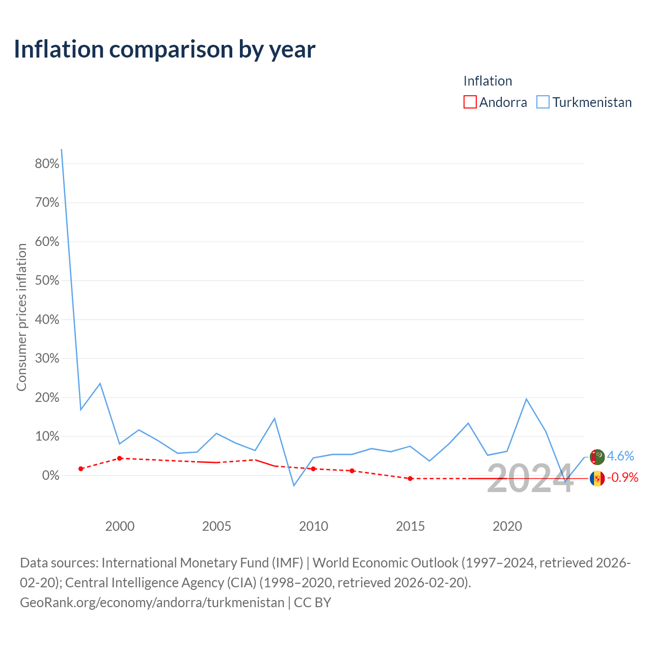 Over the past 23 years, Andorra has recorded an average annual inflation rate of 1.49%, compared with 8.2% in Turkmenistan. In 2020, inflation was -0.9% in Andorra and 4.6% in Turkmenistan.