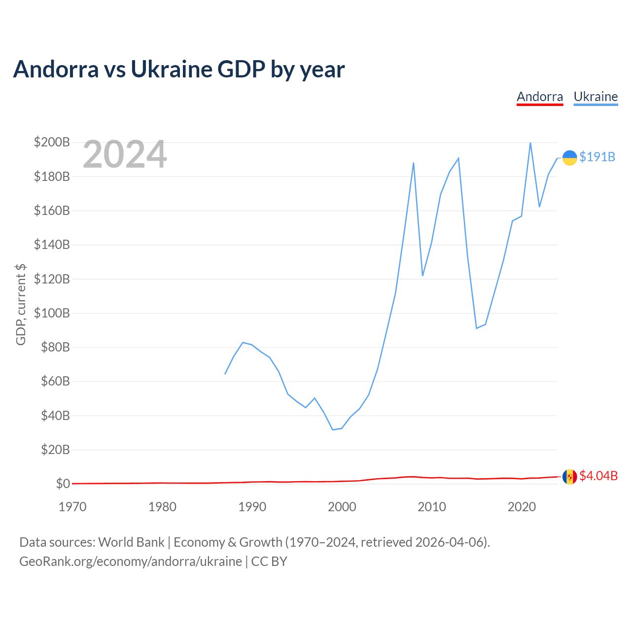 Andorra has a GDP of $4.04B compared to $191B for Ukraine, ranking 166/197 and 57/197 by economy size, respectively.