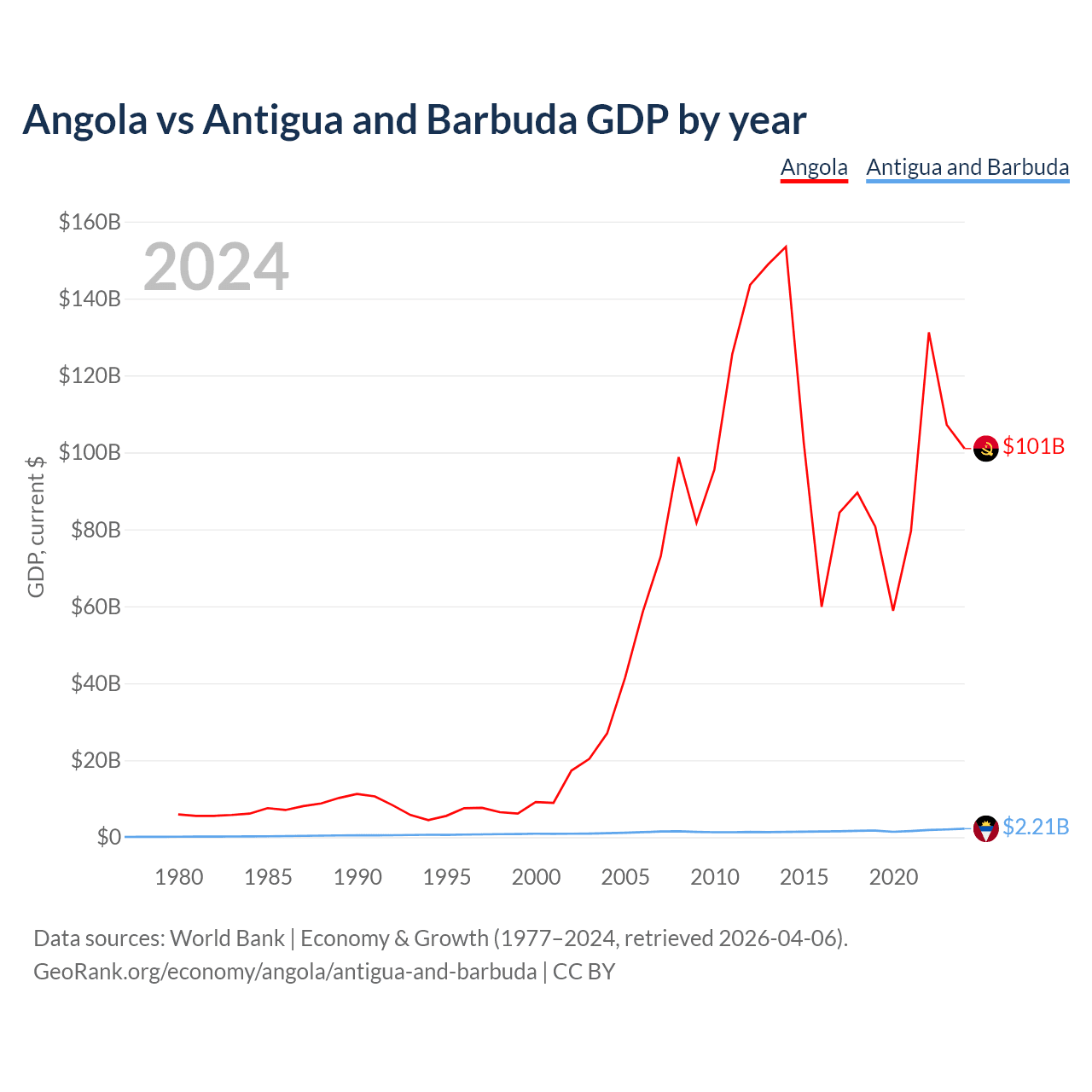 Angola has a GDP of $101B compared to $2.21B for Antigua and Barbuda, ranking 71/197 and 177/197 by economy size, respectively.