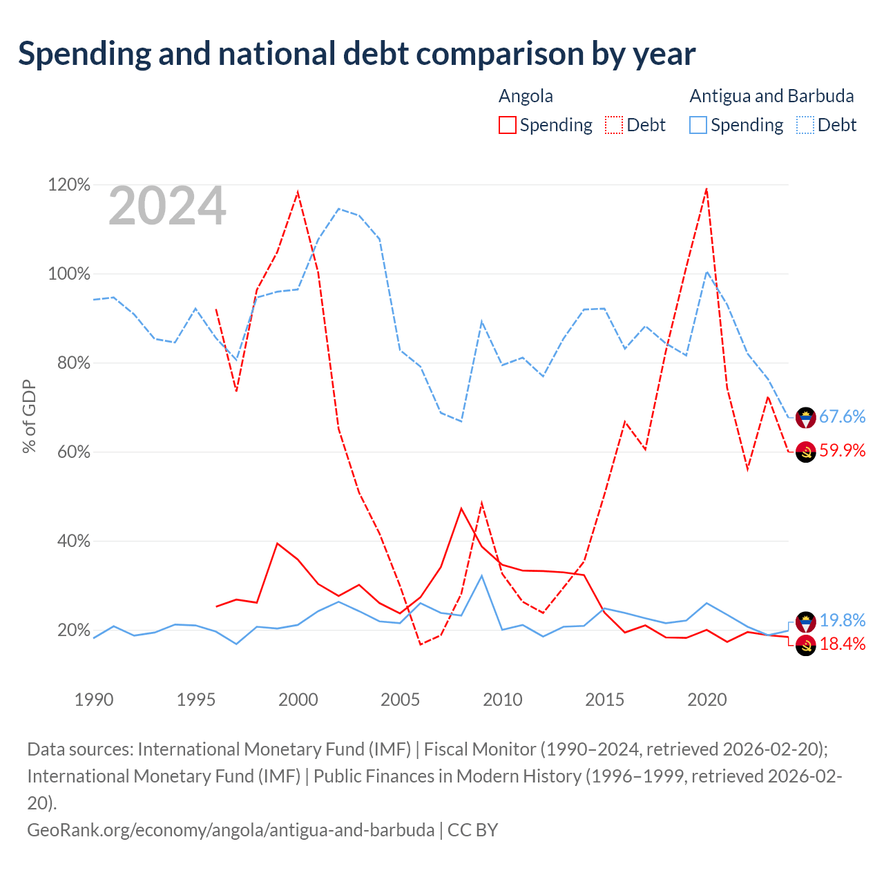 Angola has $60.5B in government debt (59.9% of GDP), compared to $1.49B (67.6% of GDP) in Antigua and Barbuda.